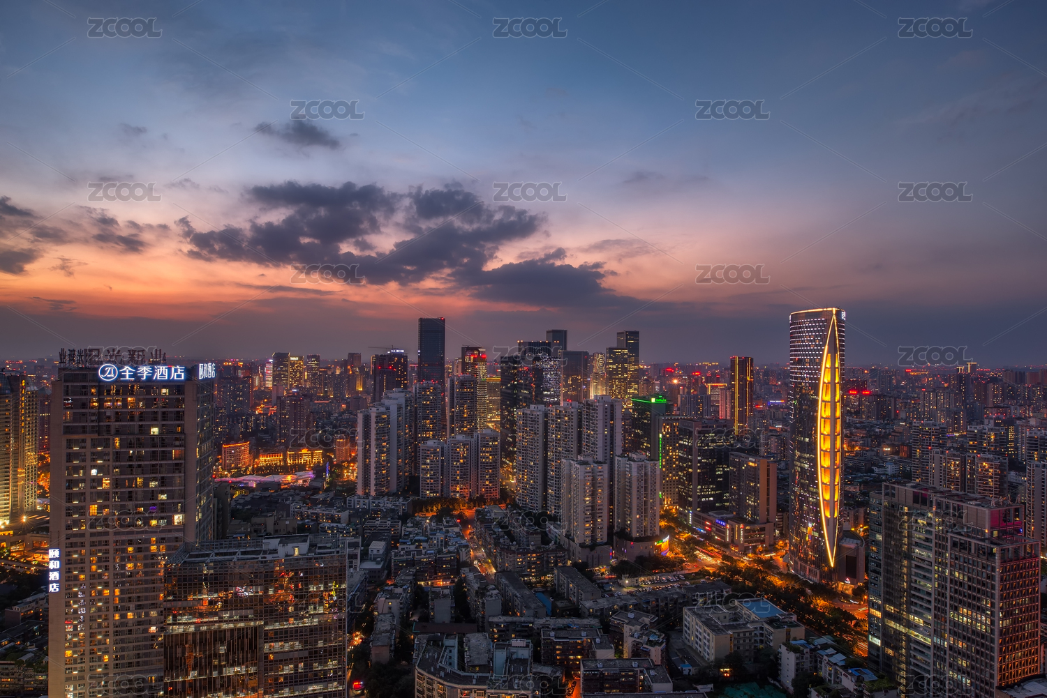 亚洲中国四川成都市中心建筑亮灯日落全景
