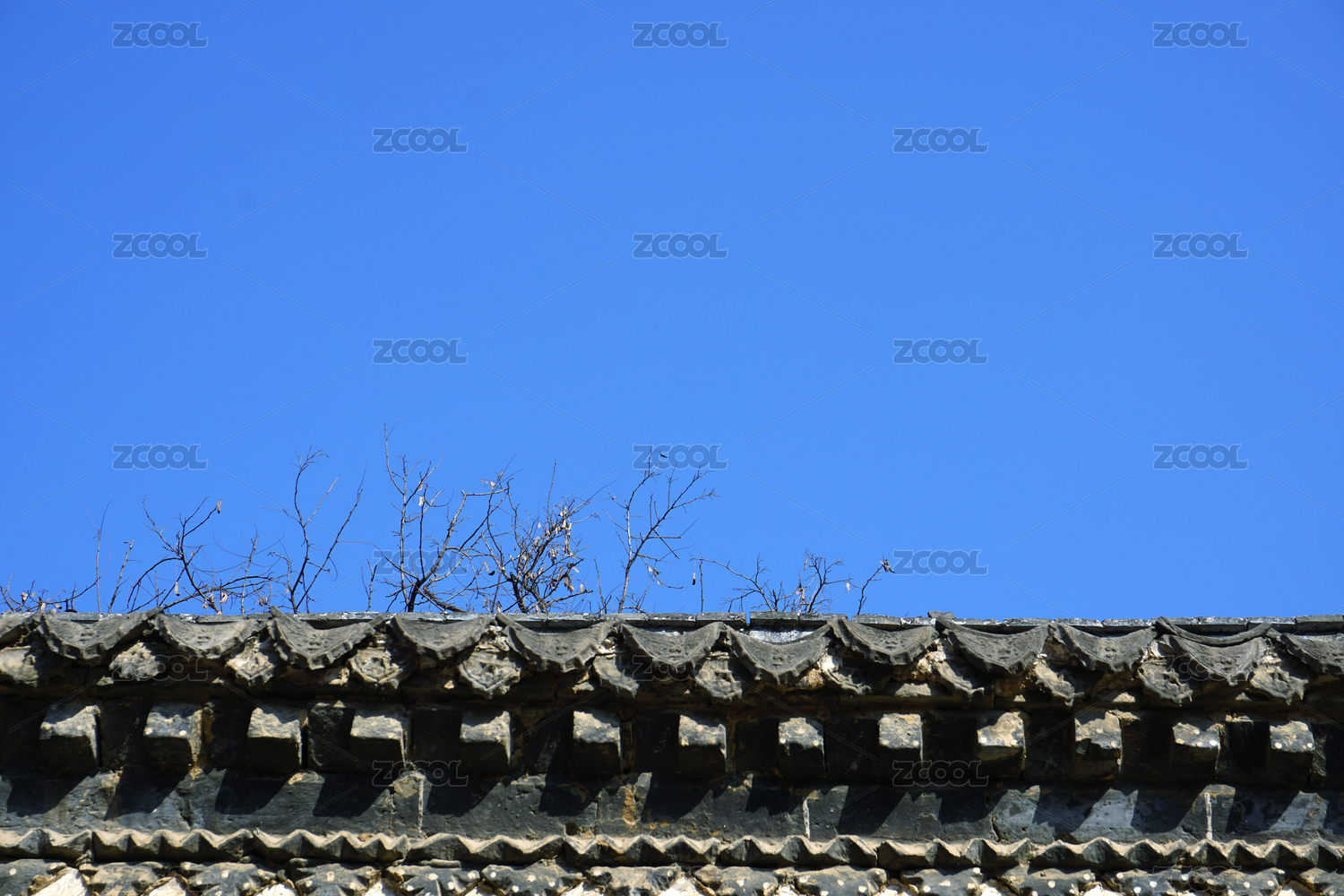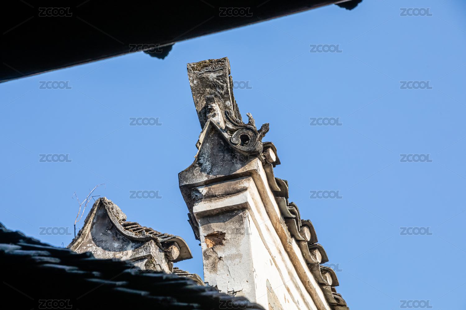 蓝天下的中国传统样式建筑山墙特写