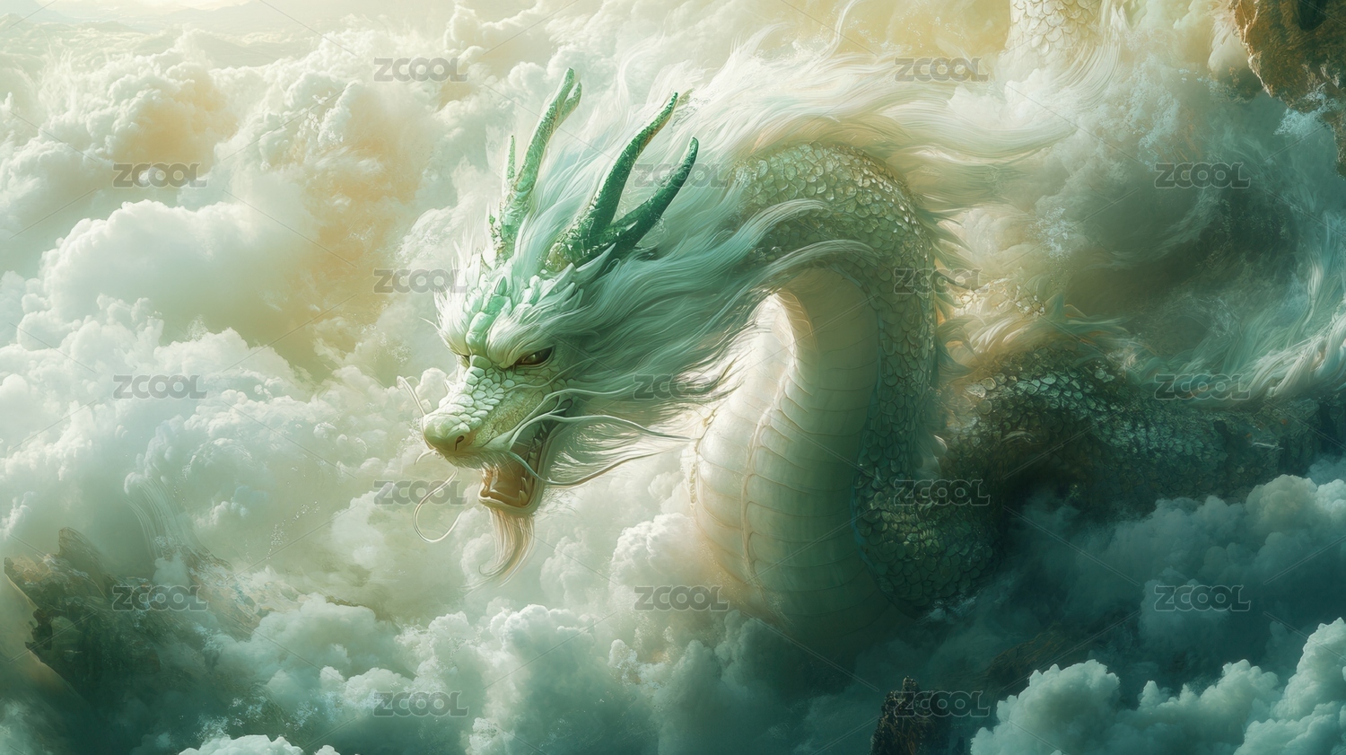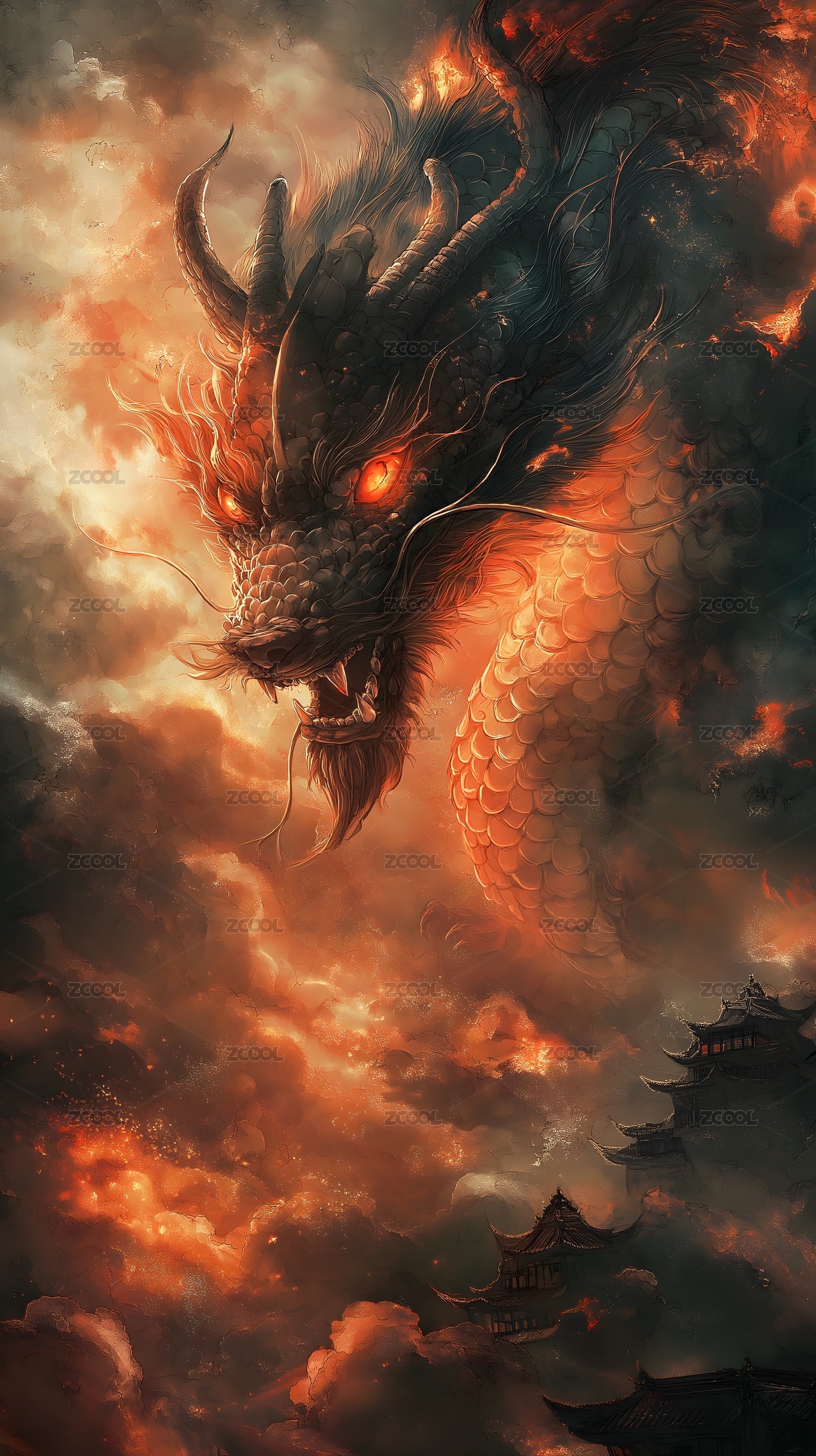 电影灯光,中国文化,鲜艳色彩,奇幻场景,橙色,黄色,火焰龙,烟雾,暴风云,高画质