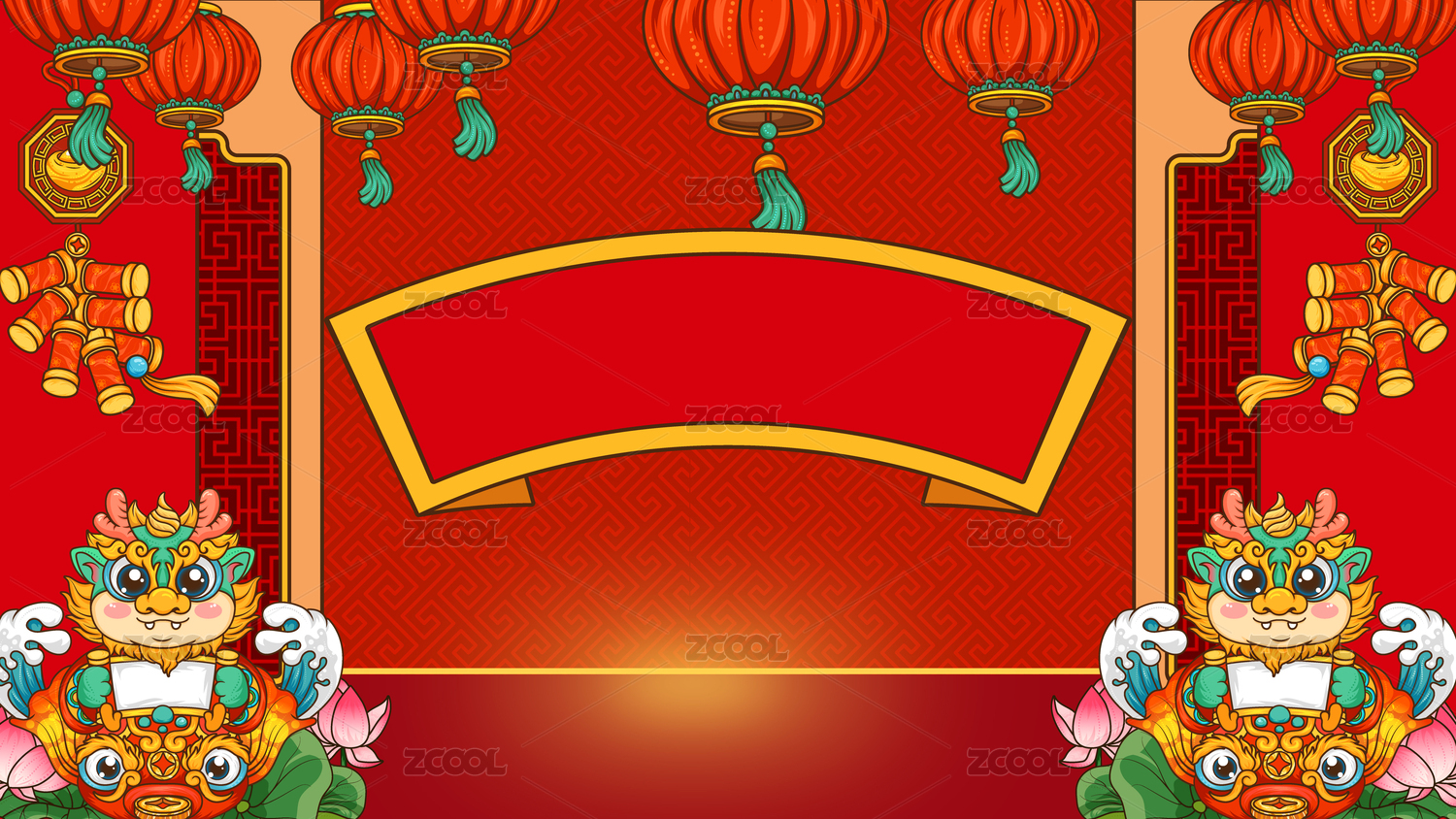 龙年矢量灯笼开门红喷钱枪荷花中国红背景墙
