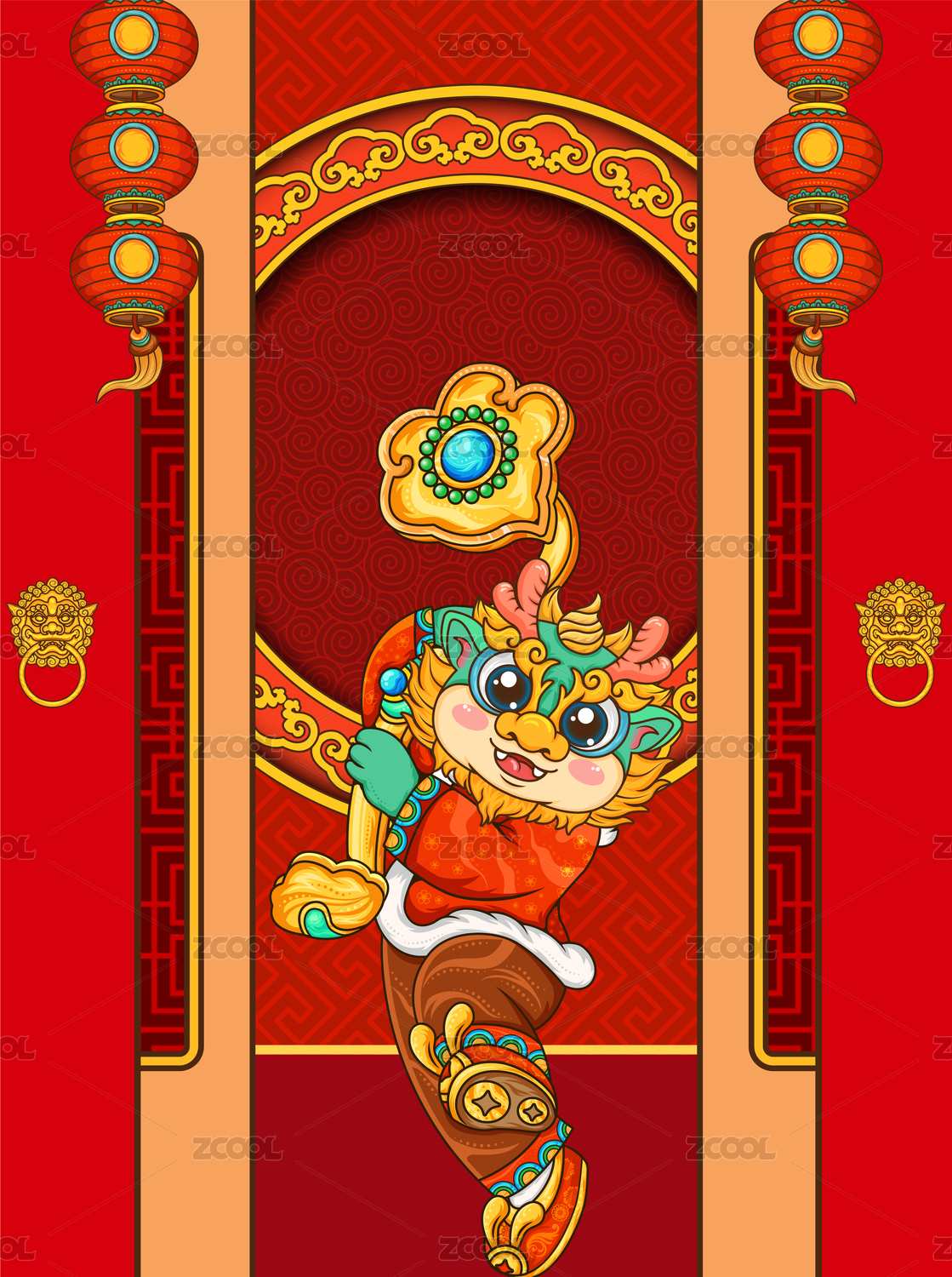 矢量龙年生肖新年春节开门大吉拜年封面背景
