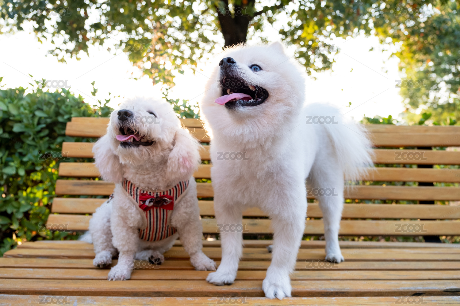 坐在公园长椅上的宠物博美犬和比熊犬