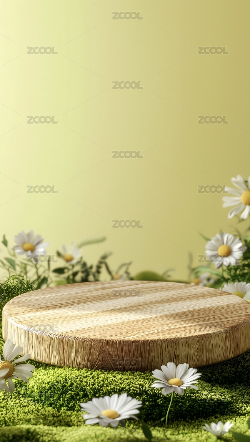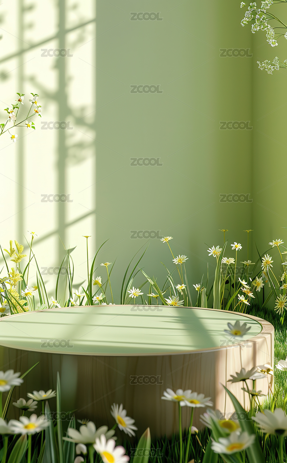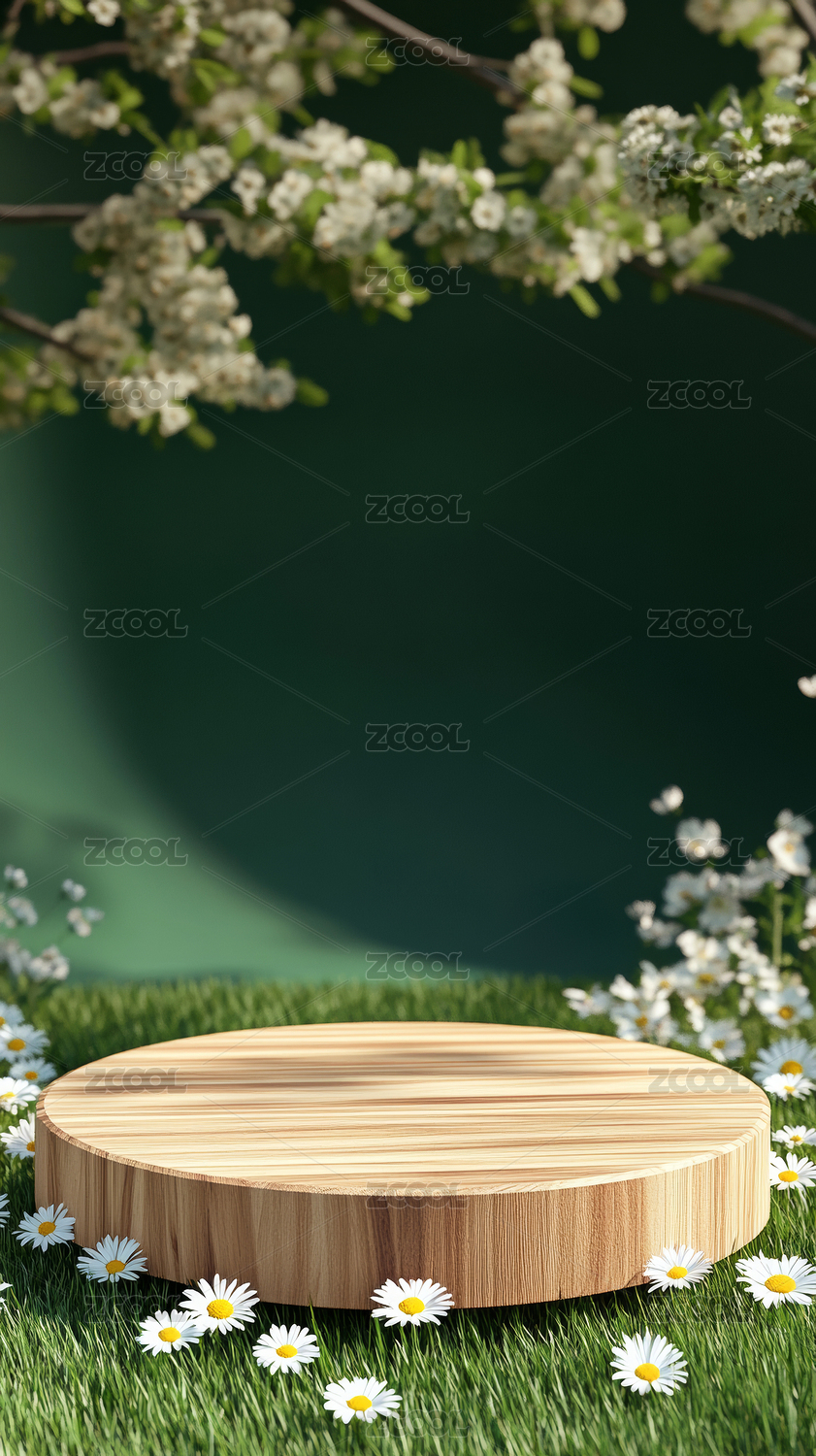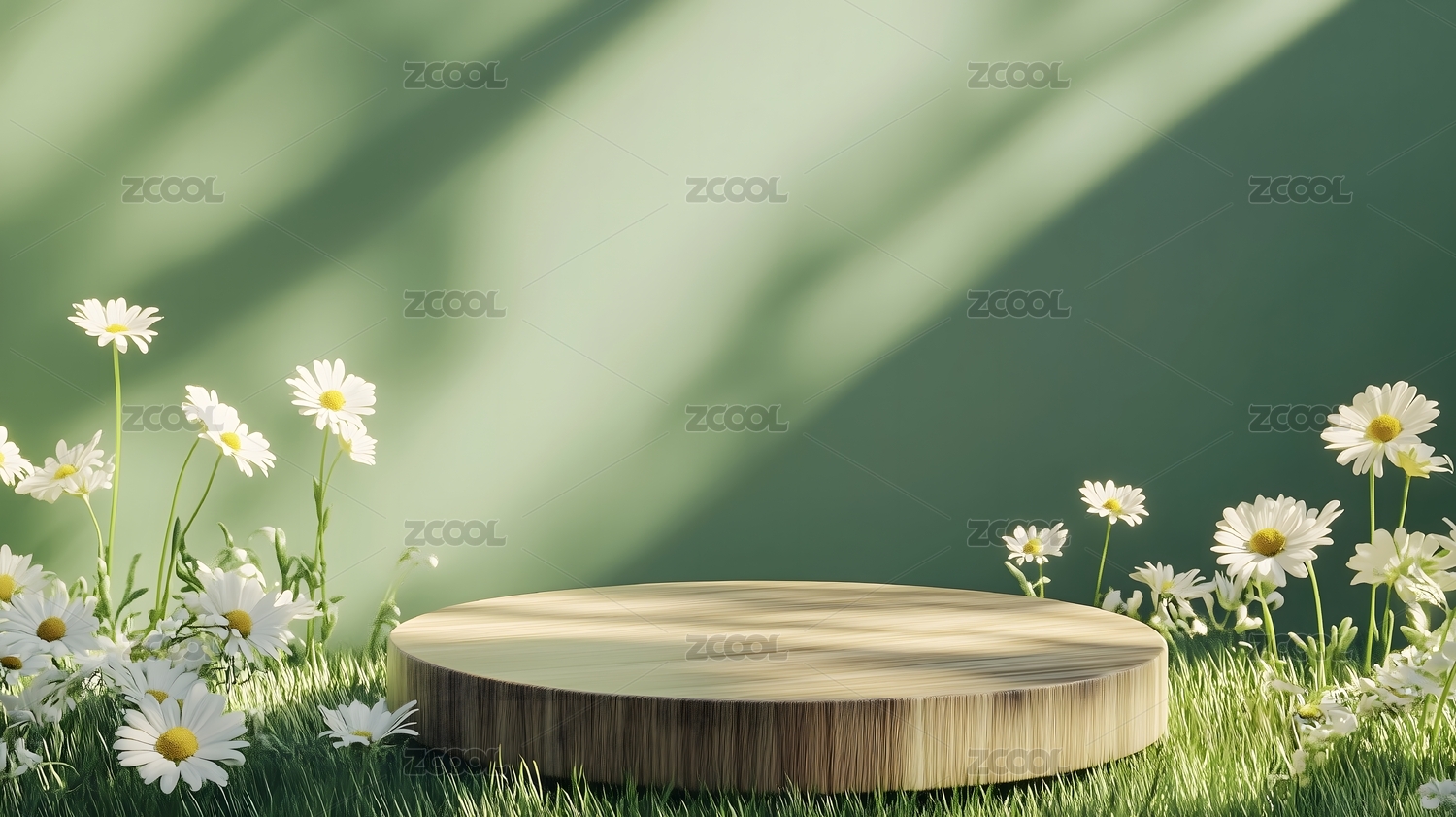 木质圆形展台,产品展示,商品展示,背景,清新,自然,花草,绿草,花朵,白色花朵