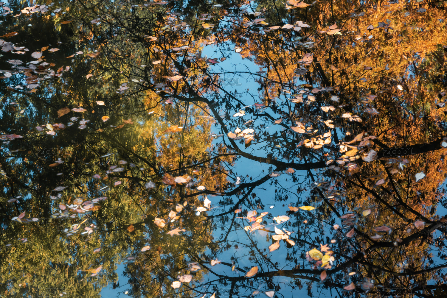 九寨沟秋色,静谧蓝色湖面和金秋黄叶