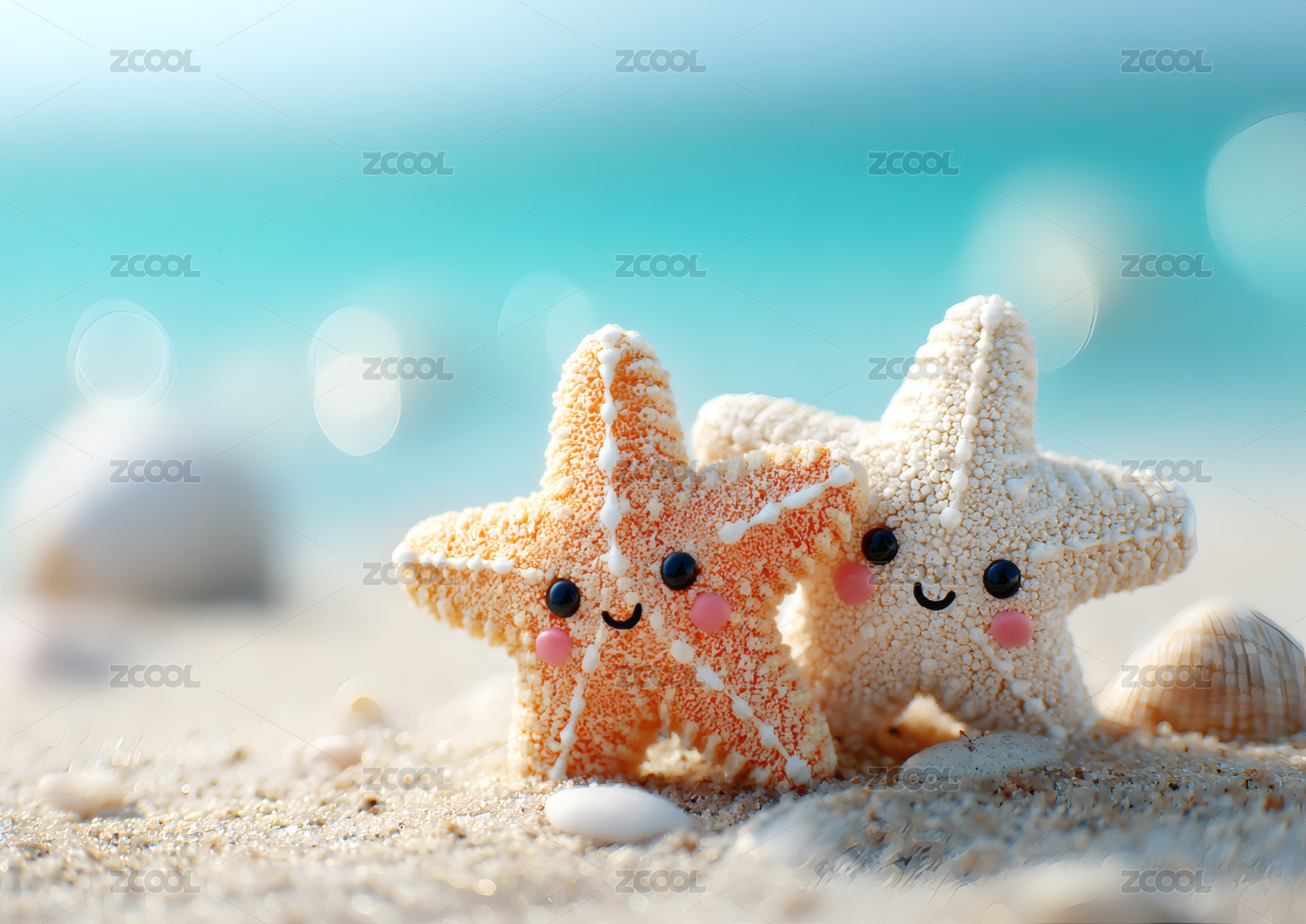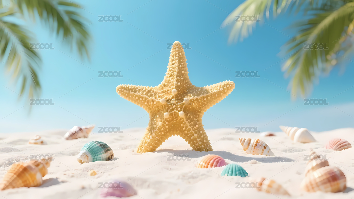 夏天蓝天白云下海滩上墨镜的卡通海星