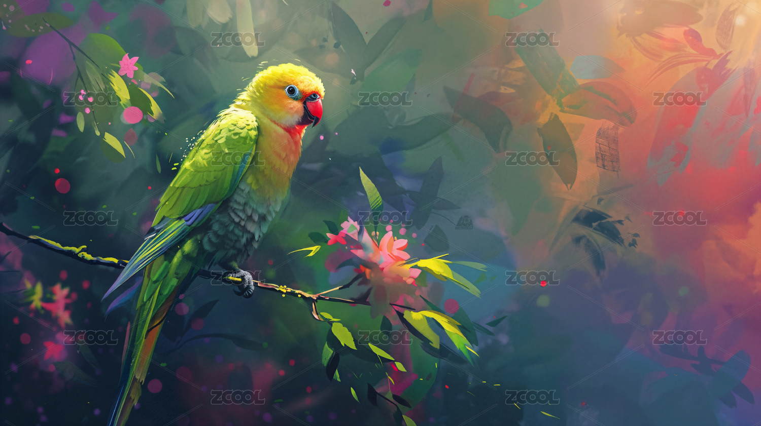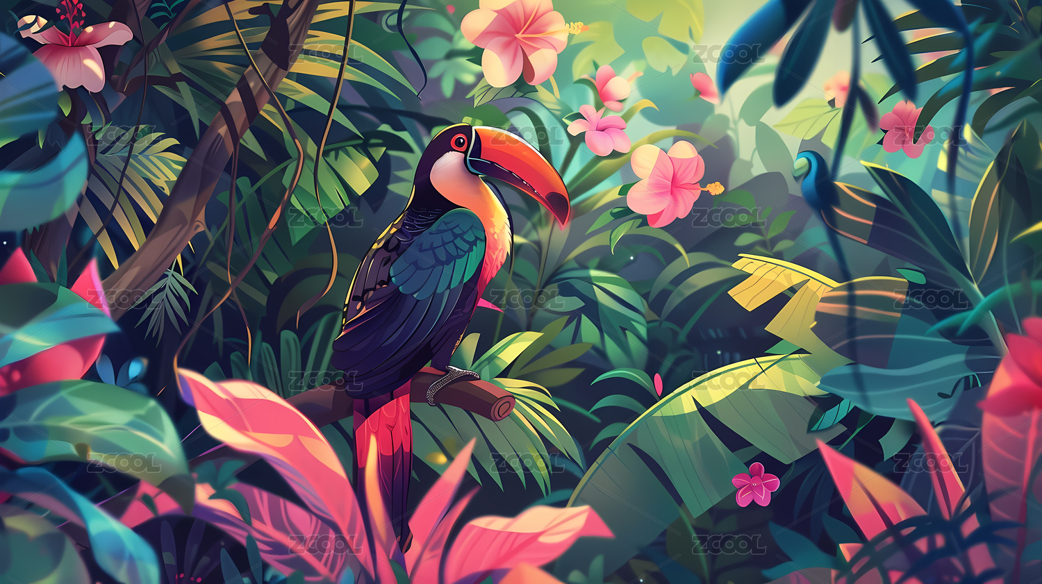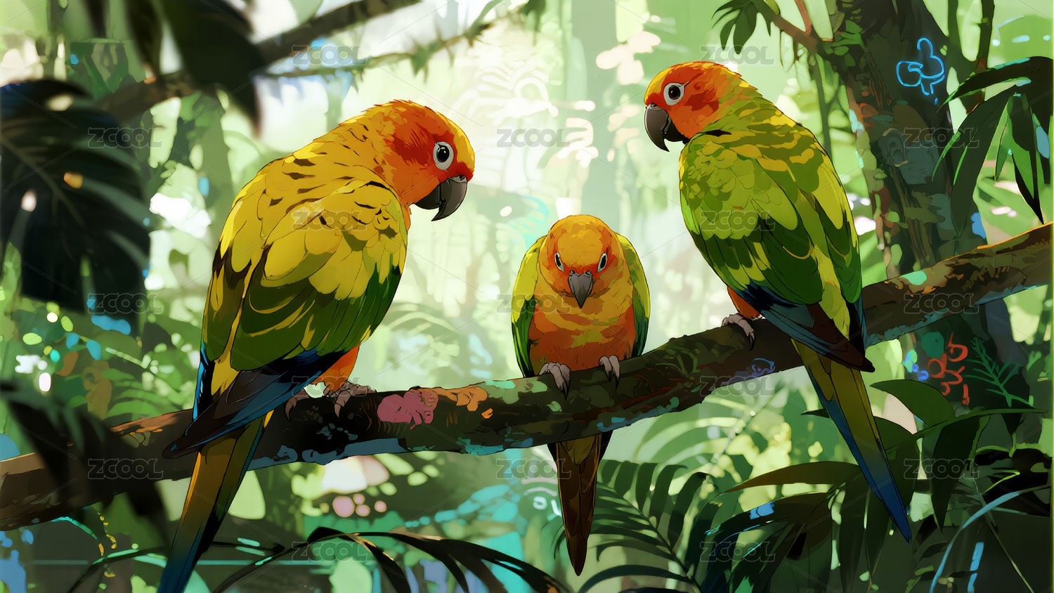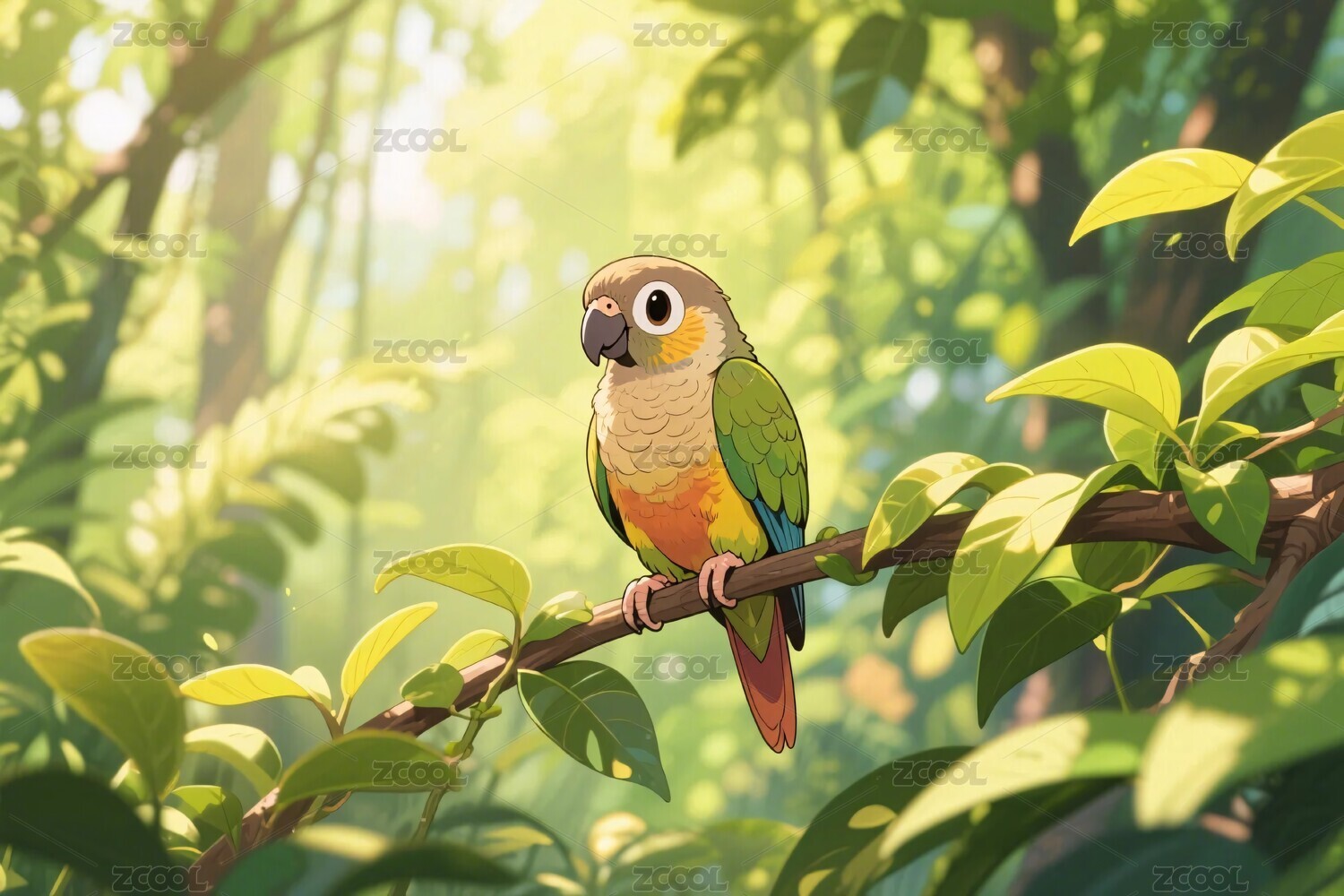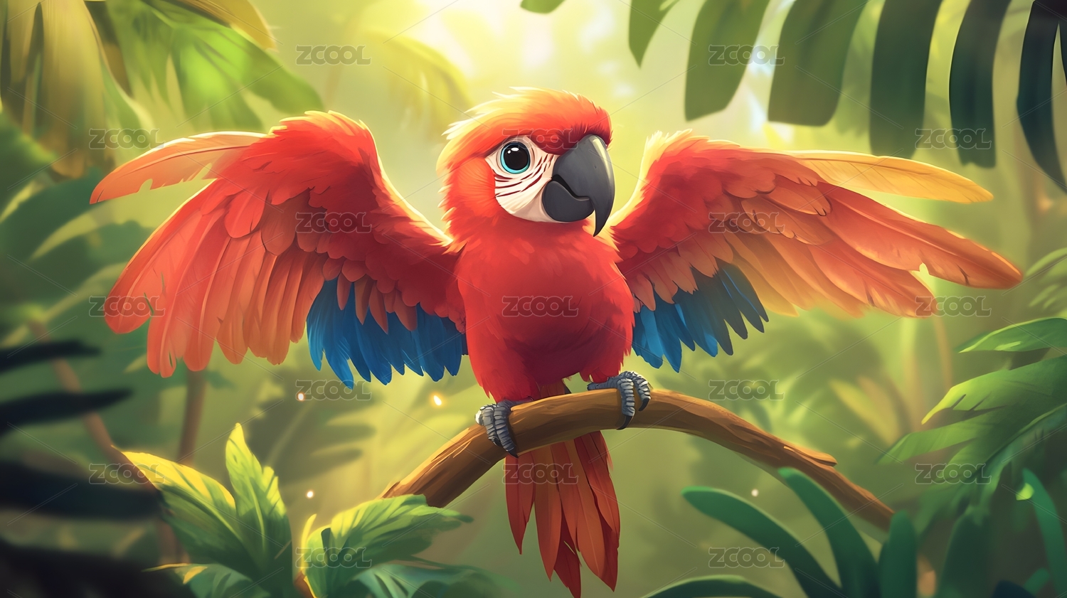 卡通,插画,可爱,鹦鹉,绿色,雨林,树叶