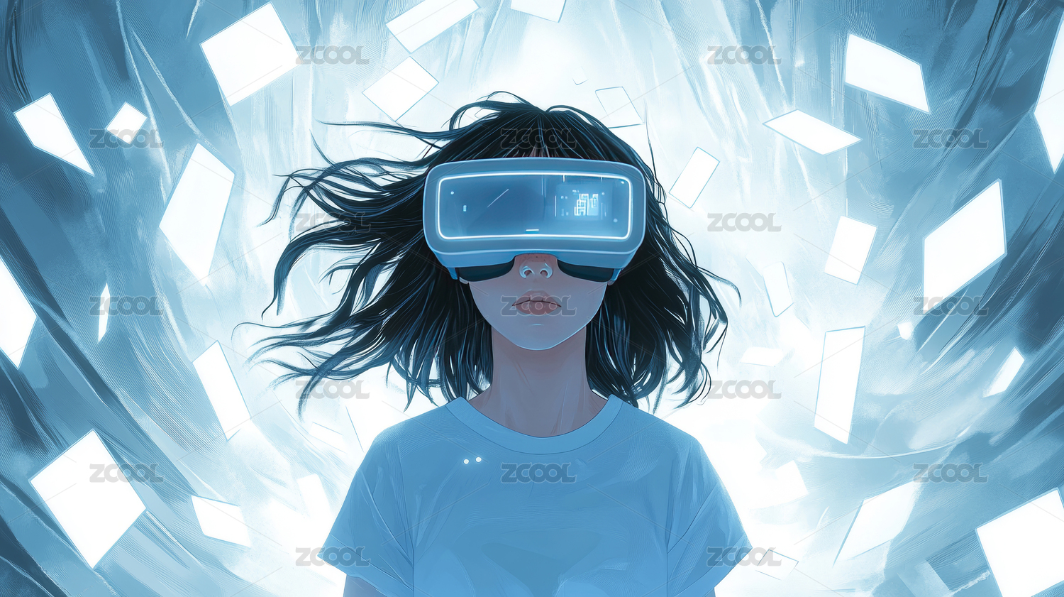 女孩室内带科幻全息VR眼镜的3d立体插画