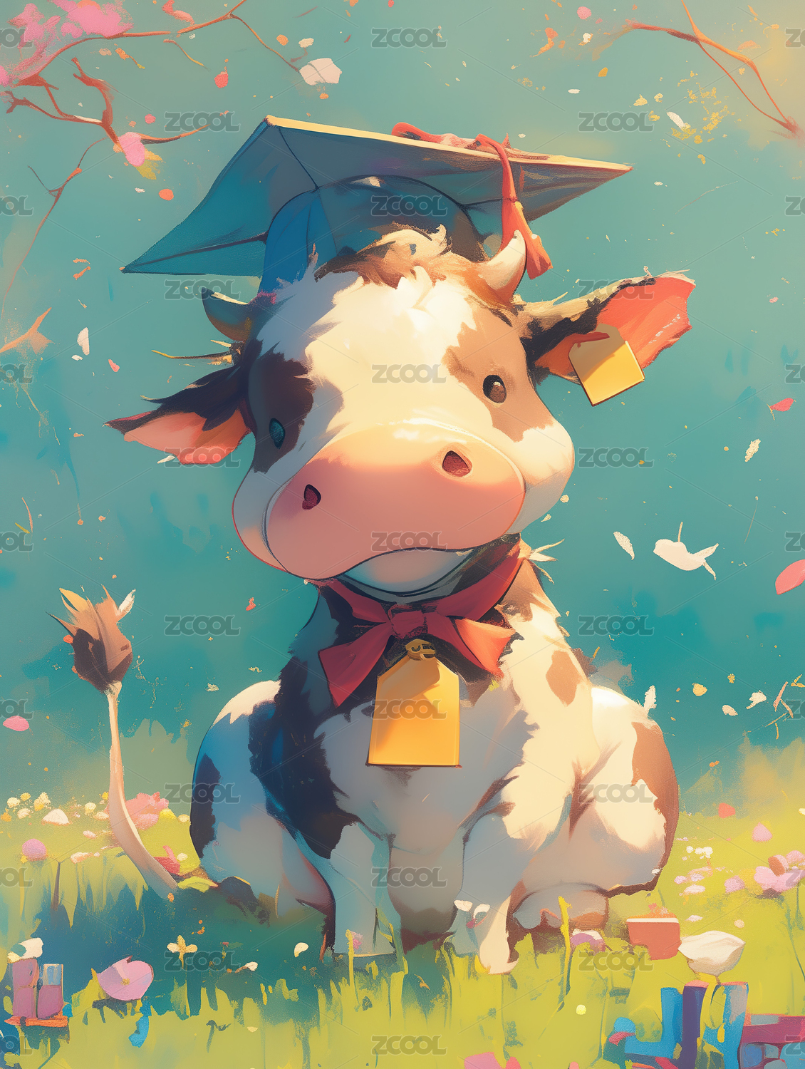 插画,清新,奶牛,博士帽,明亮,色彩,卡通