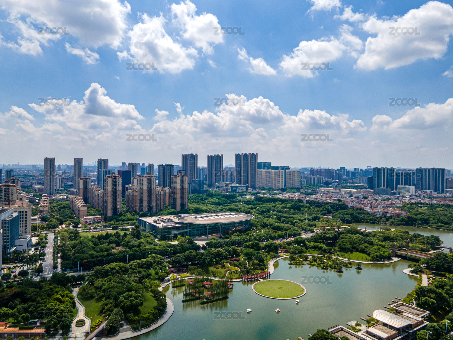 航拍中国广东佛山千灯湖公园湖泊水体景观