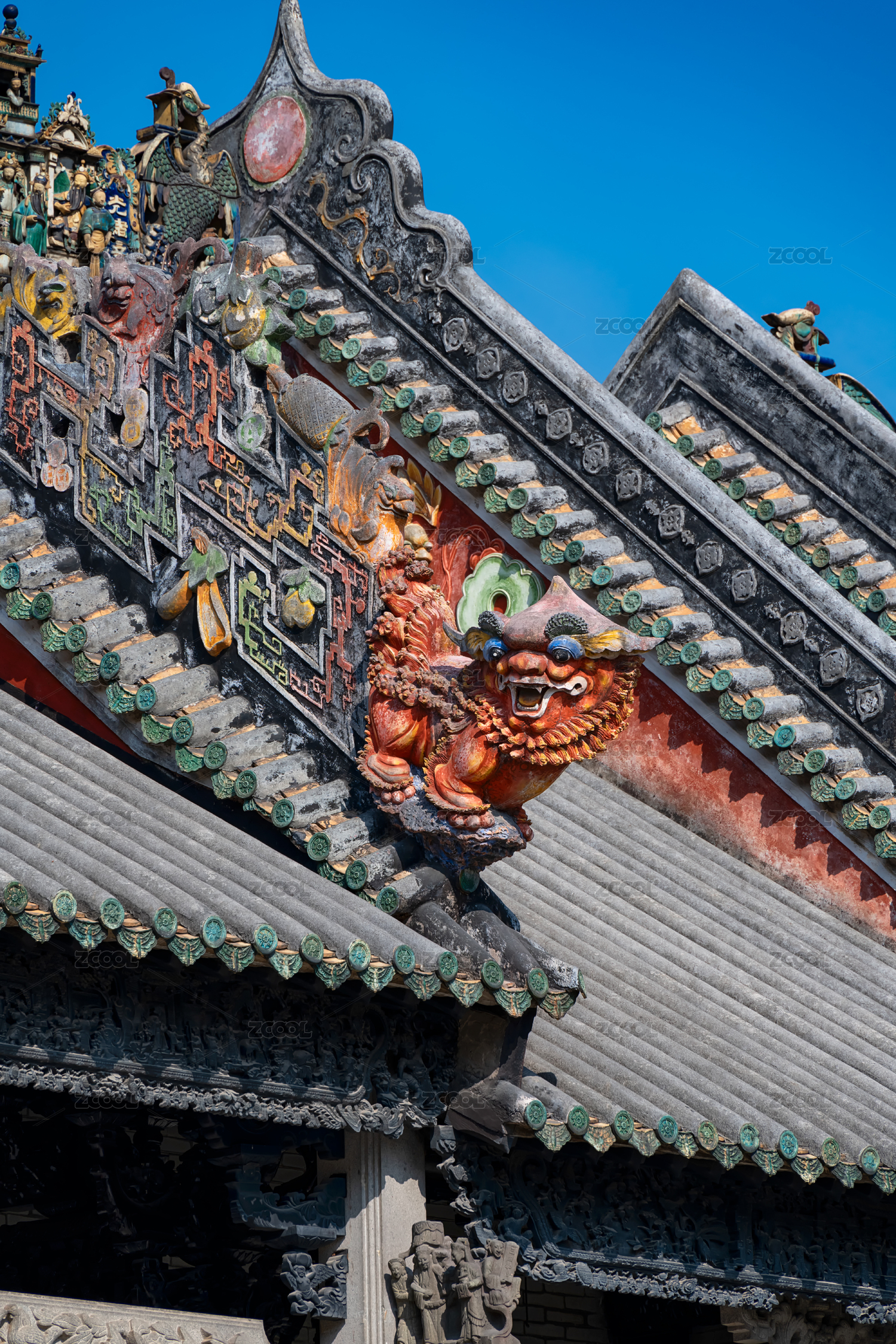 中国广州陈家祠岭南建筑屋顶灰塑陶塑和石狮