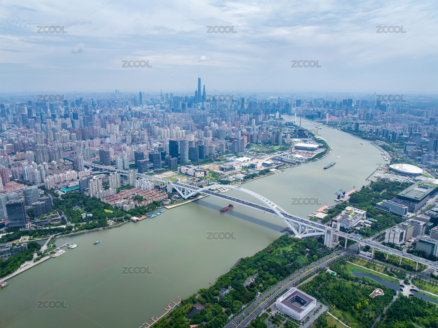 远眺上海黄浦江卢浦大桥陆家嘴三件套