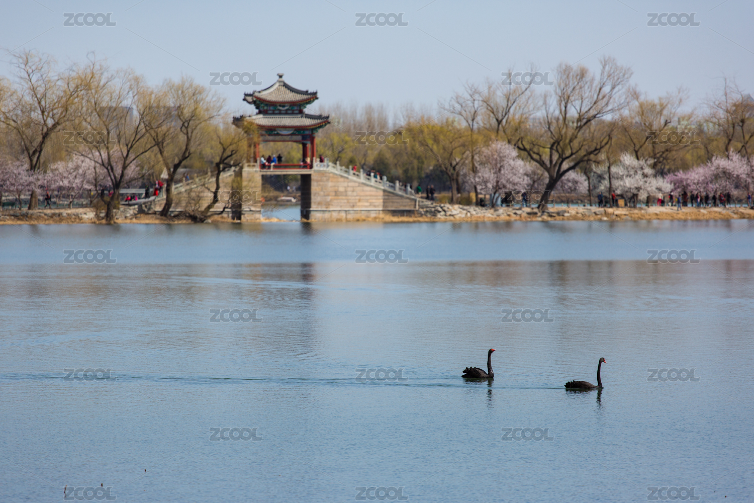 北京颐和园公园春季桃花湖水西堤传统古建筑