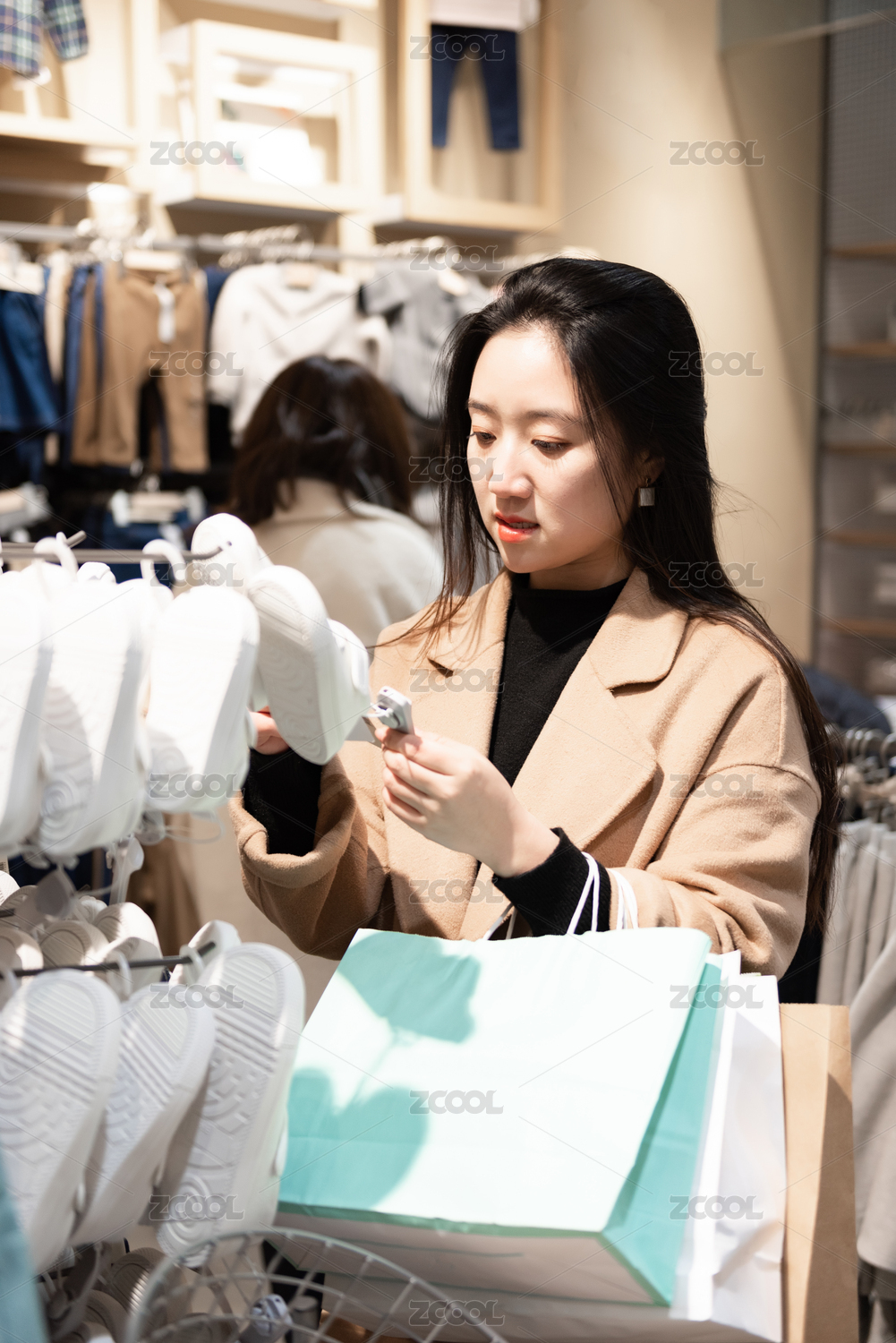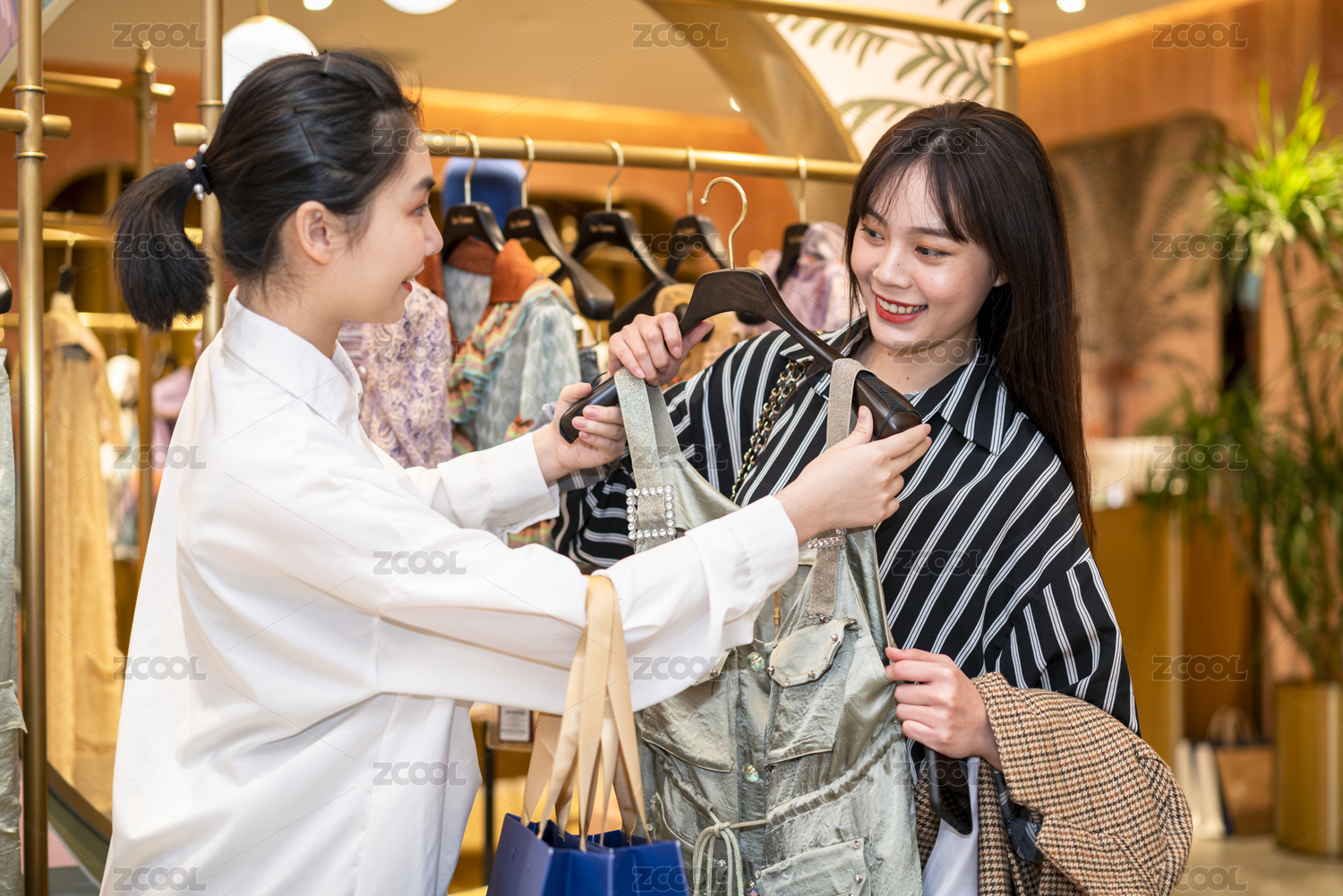 年轻漂亮的年轻女性在商场寻找挑选试穿服装