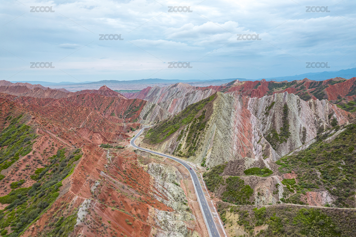 甘肃张掖蓝天下一条公路穿过七彩丹霞地貌山谷