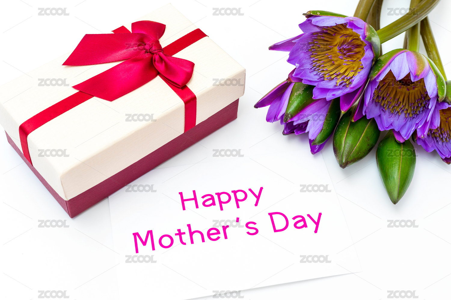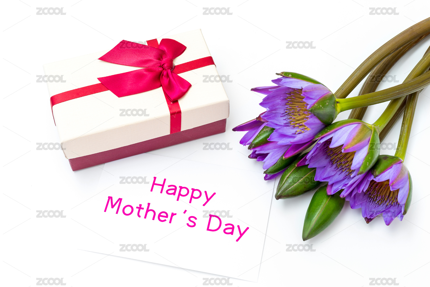 白色背景上的睡莲、礼物盒和母亲节贺卡