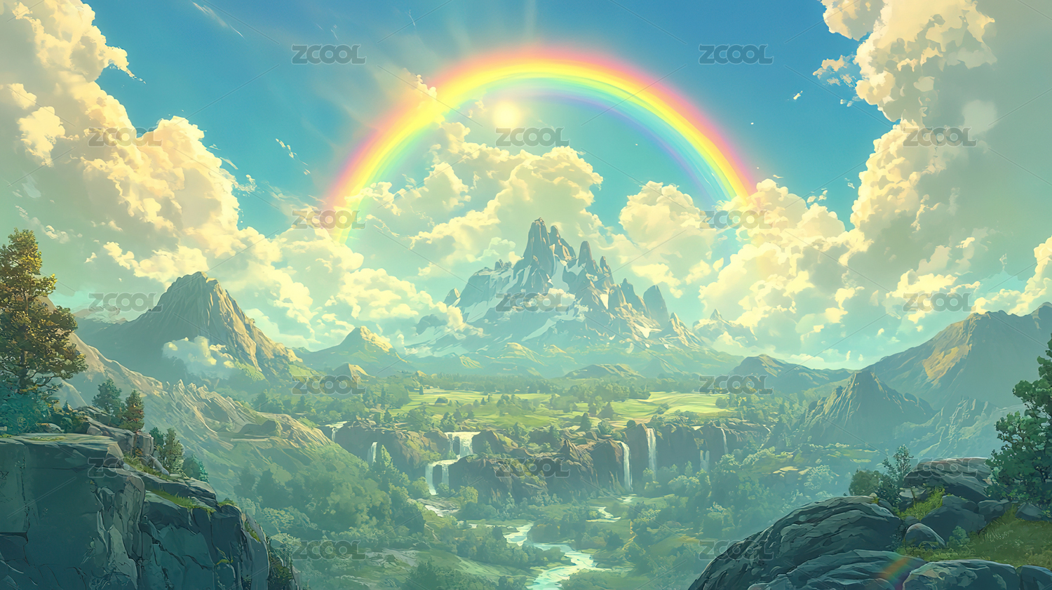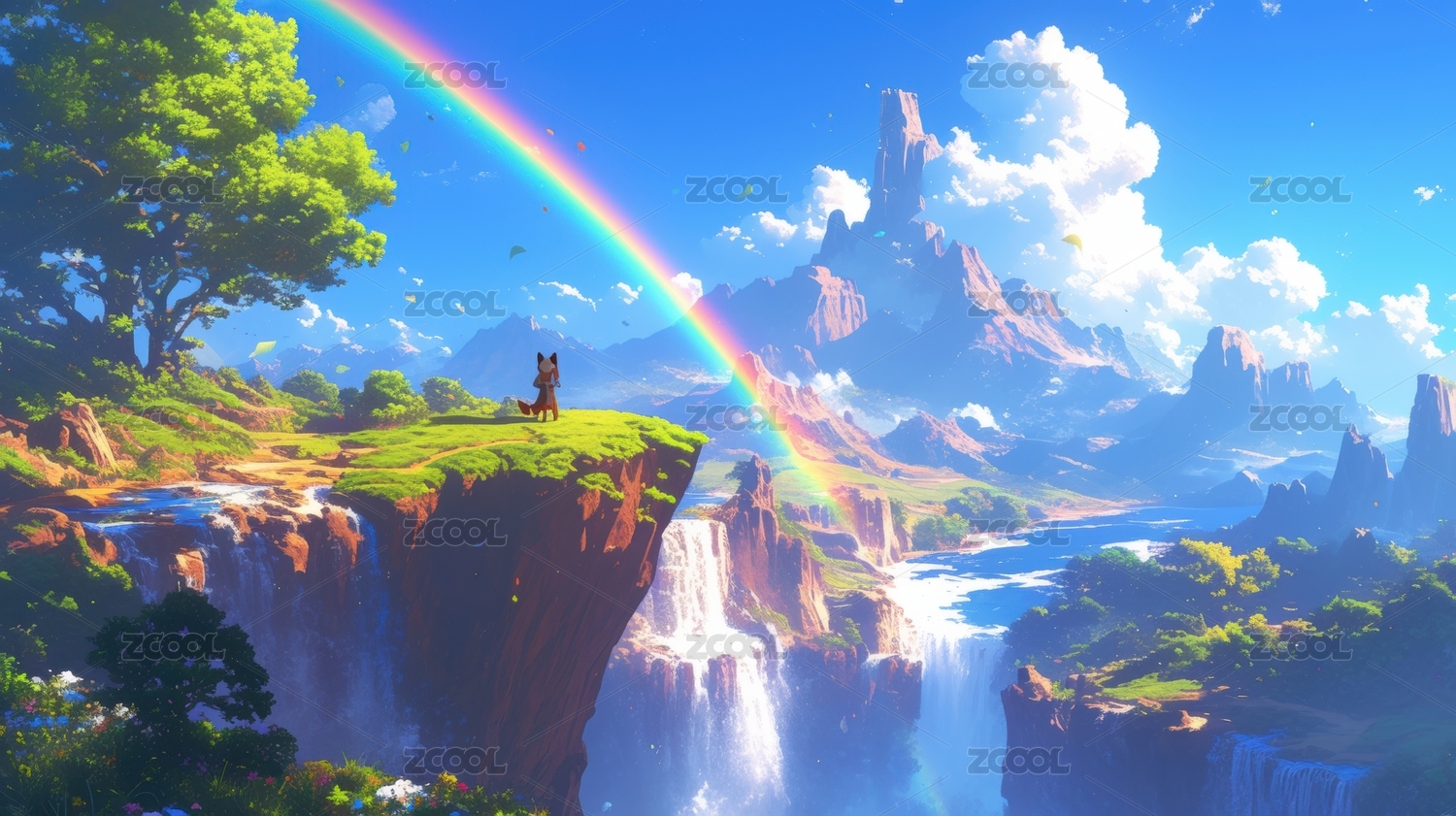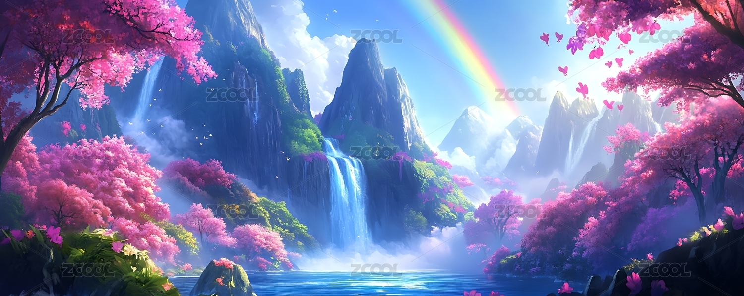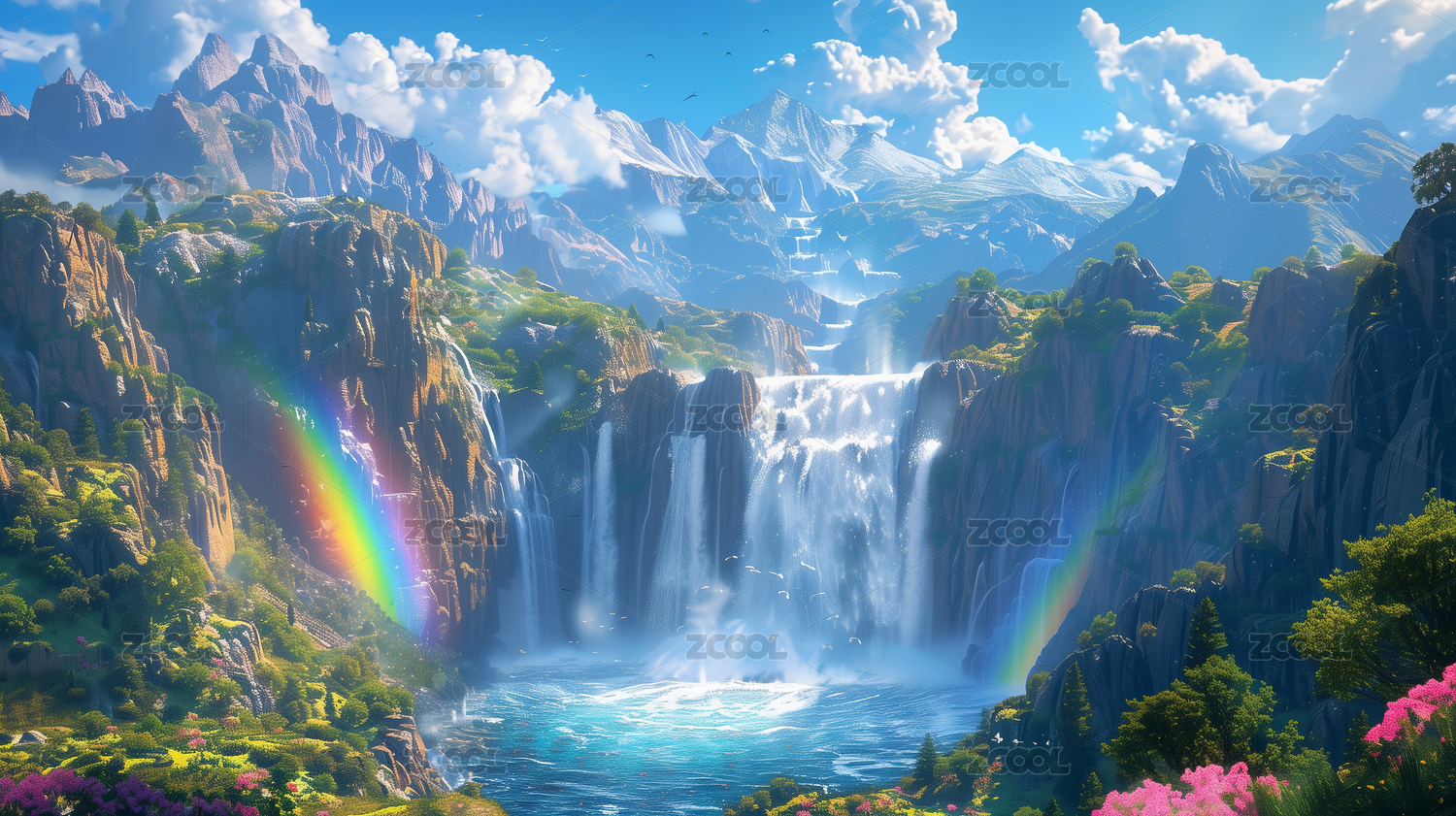 瀑布彩虹高山流水奇幻超现实大场景唯美创意
