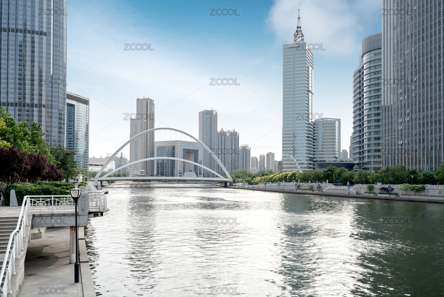 中国天津海河的水路交通和现代建筑及桥梁天际线