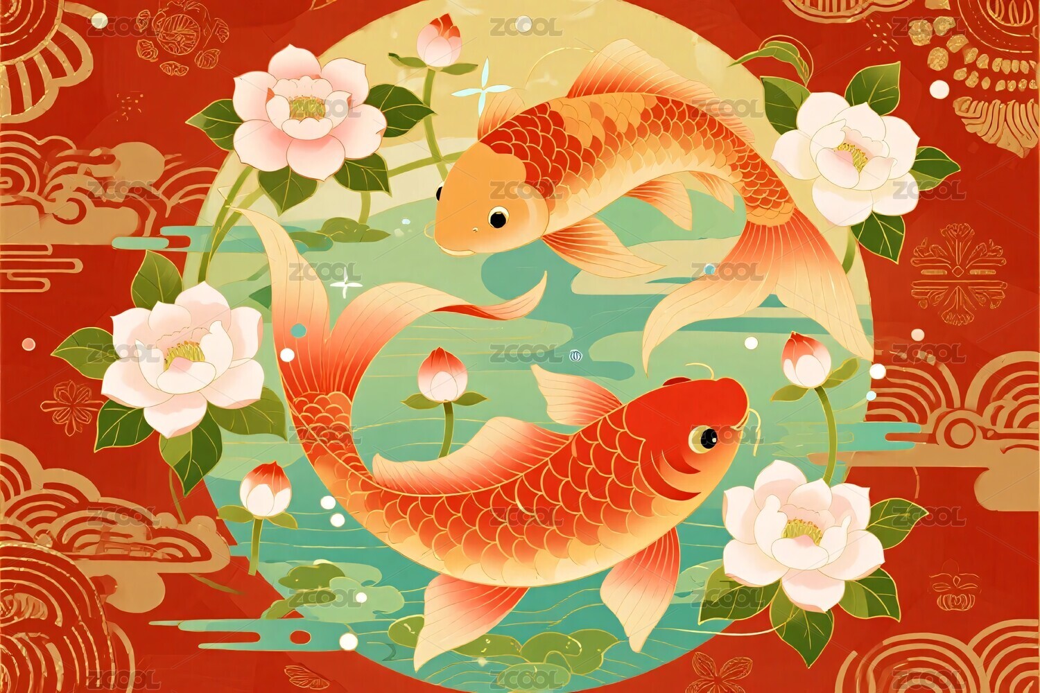 国潮,插画,国风,古风,鲤鱼,鱼,青山,建筑,国潮插画,传统文化