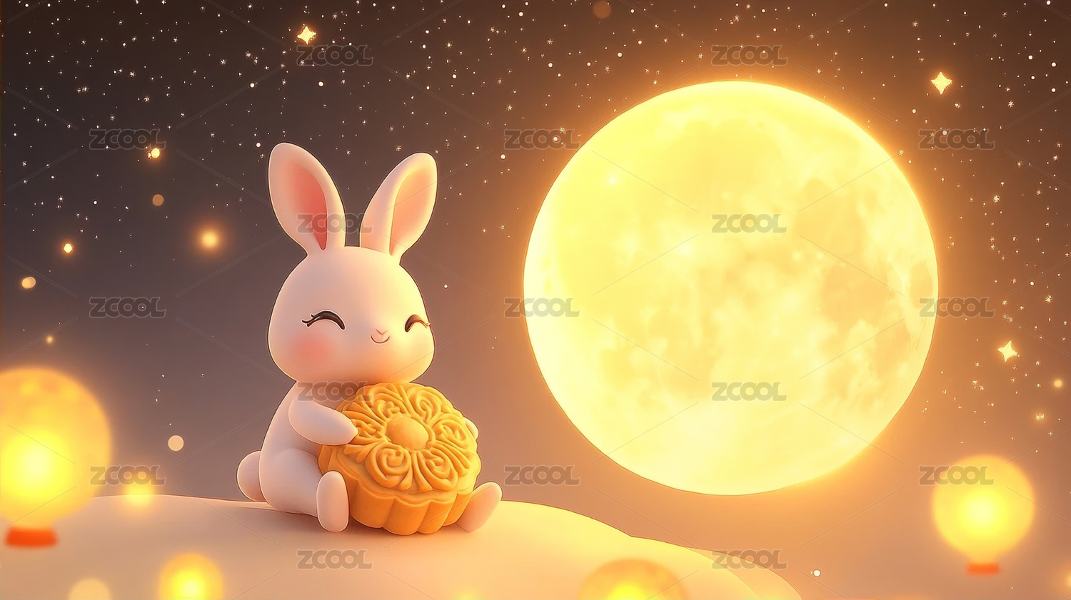 梦幻,可爱,卡通,中秋节,节气,兔子,月亮,白云,花朵,金色