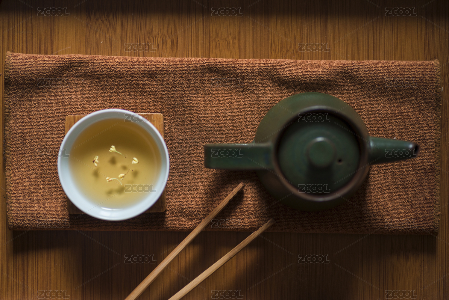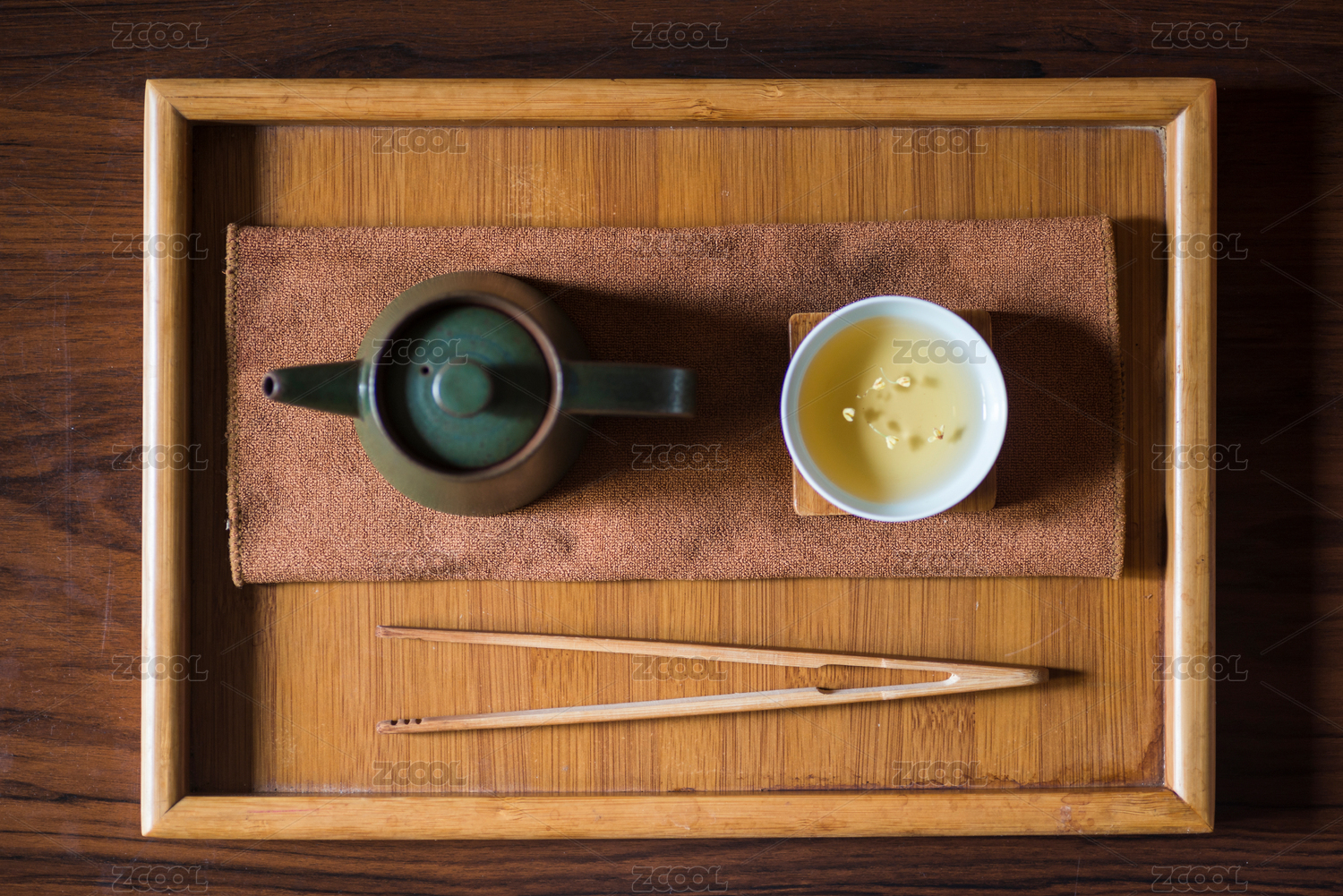 木纹桌面上放置的茶壶茶杯和木垫