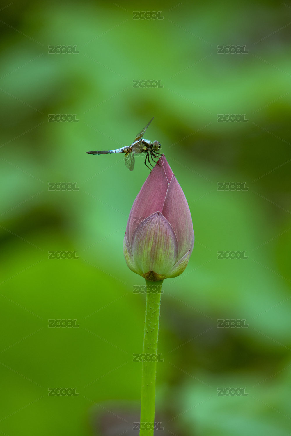 一只蜻蜓(斑麗翅蜻)在荷花花蕾上停留,特写镜头