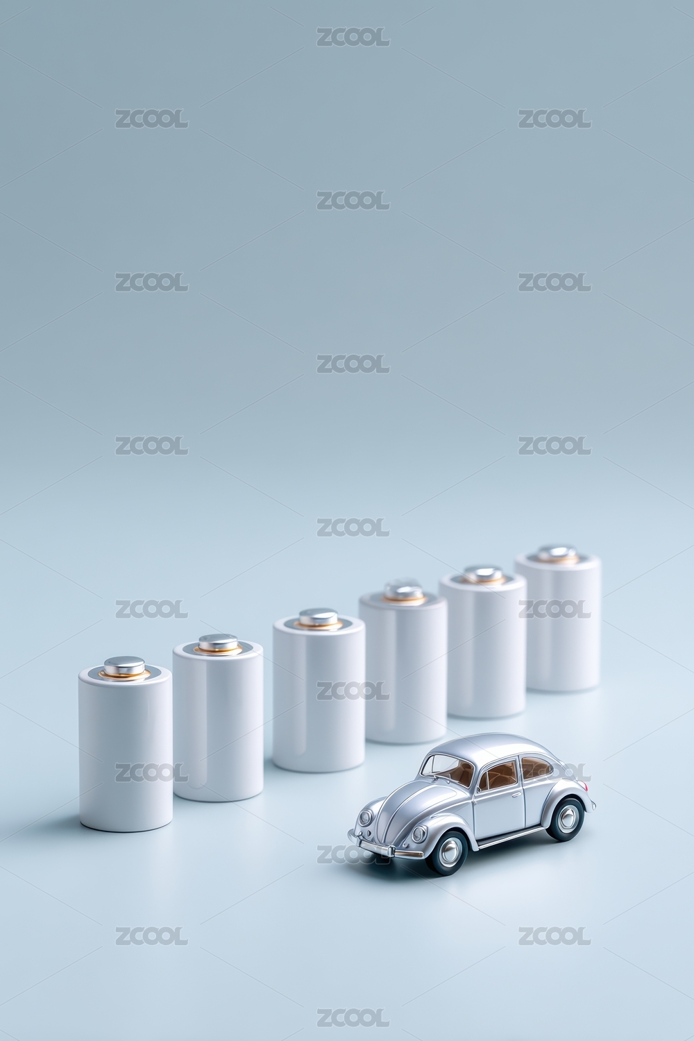 微缩创意电池铺成的道路上行驶的新能源汽车