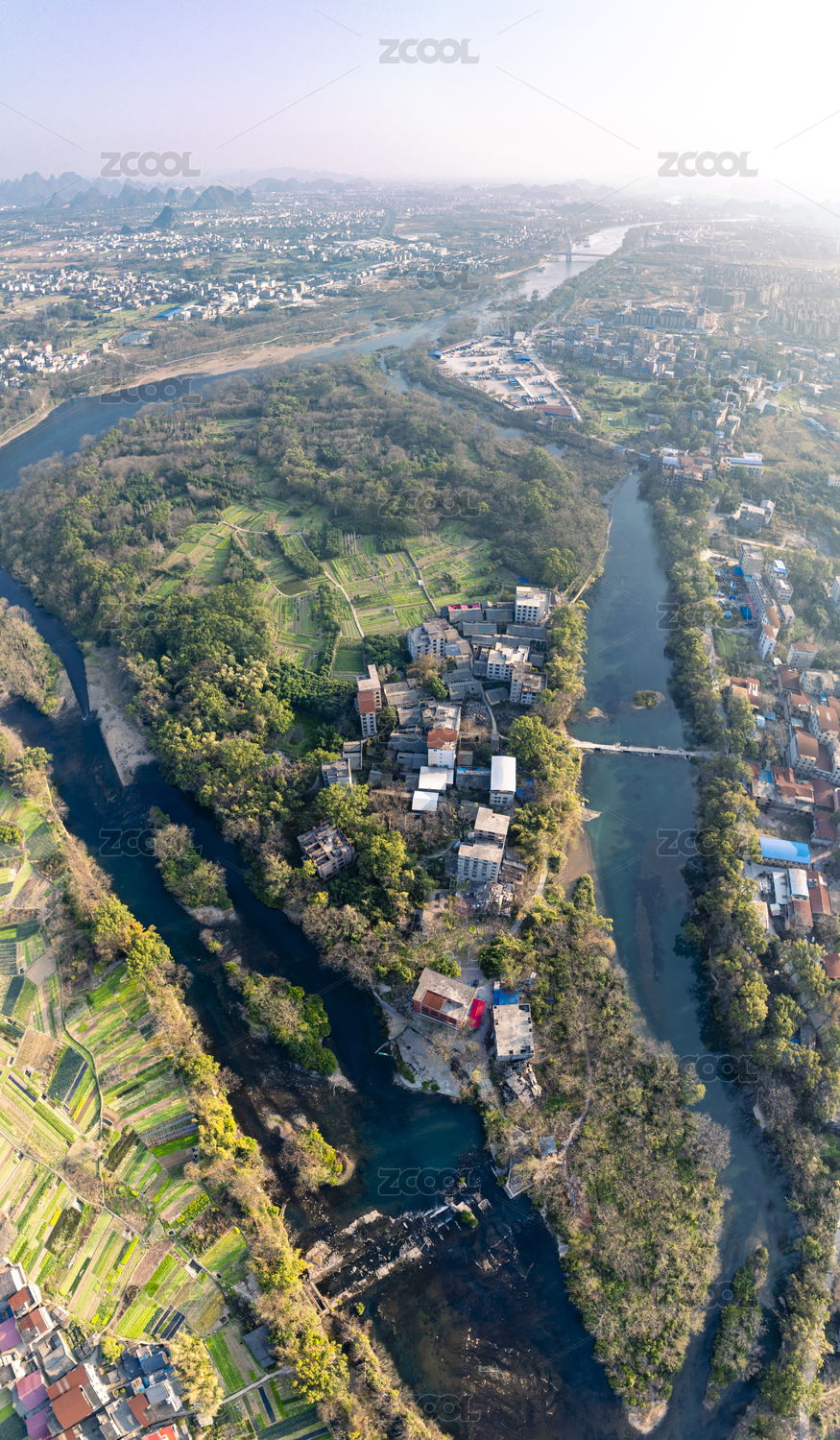 航拍广西桂林灵川漓江南洲岛河段田园风光