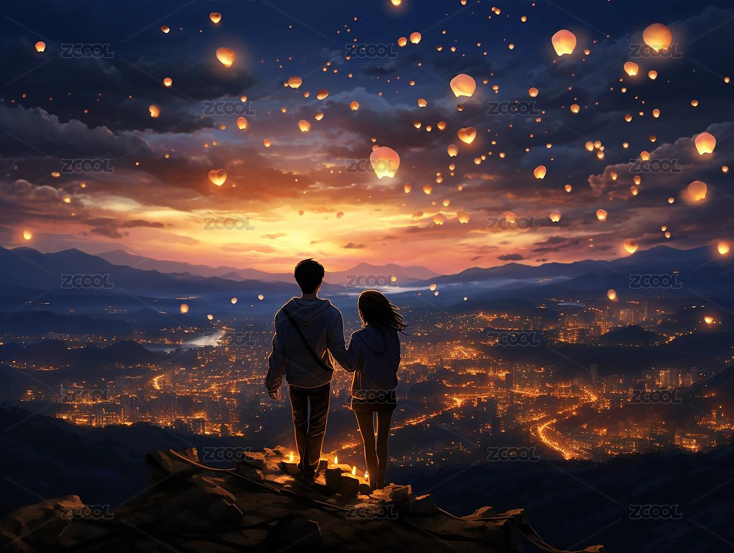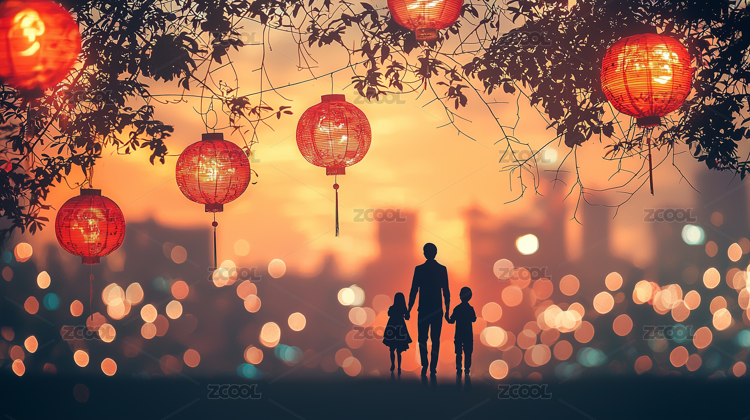 中秋,孔明灯,家庭,现代极简,复古,梦幻,蓝紫