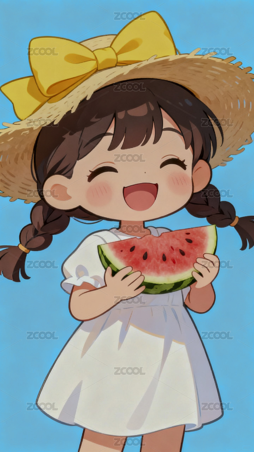 一个亚洲孩子开心抱着西瓜3d卡通插画