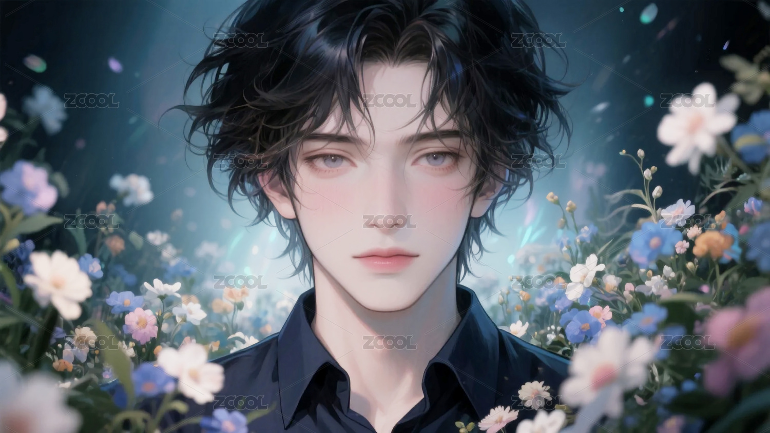男孩,男生,校服,领带,西装,灰发,黄花,花朵,光斑,模特