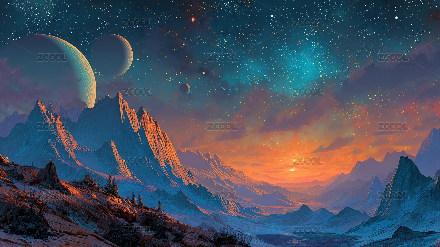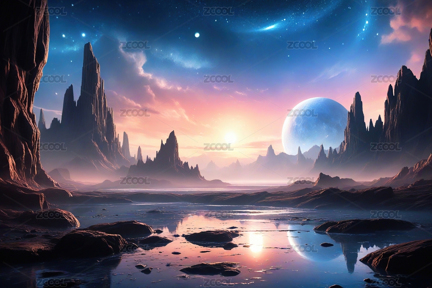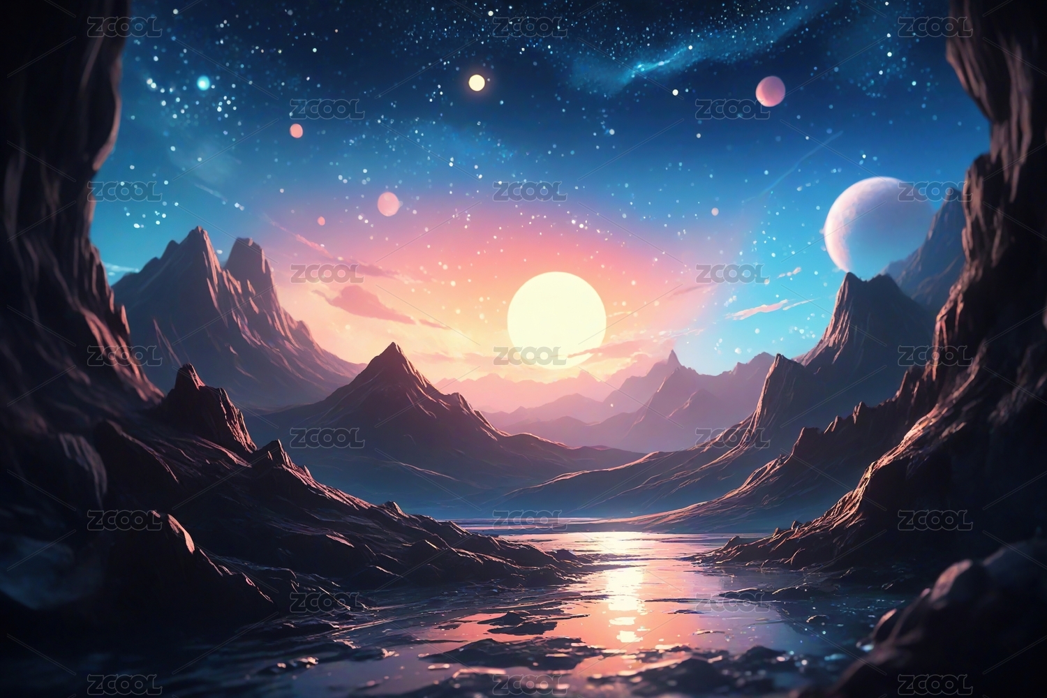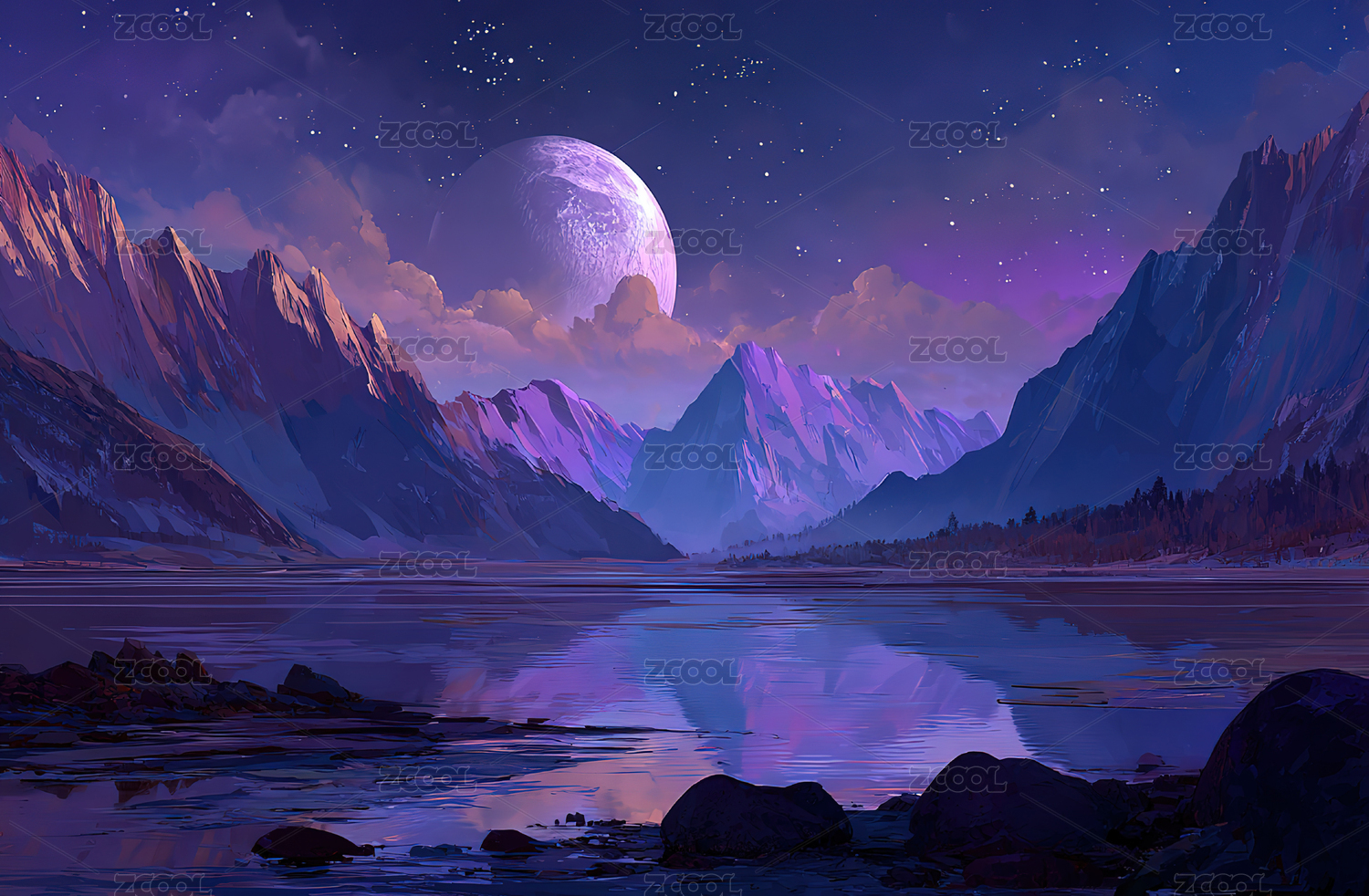 山峰,星星,月亮,湖水,反射,夜空,幻想,梦境,宇宙,星系