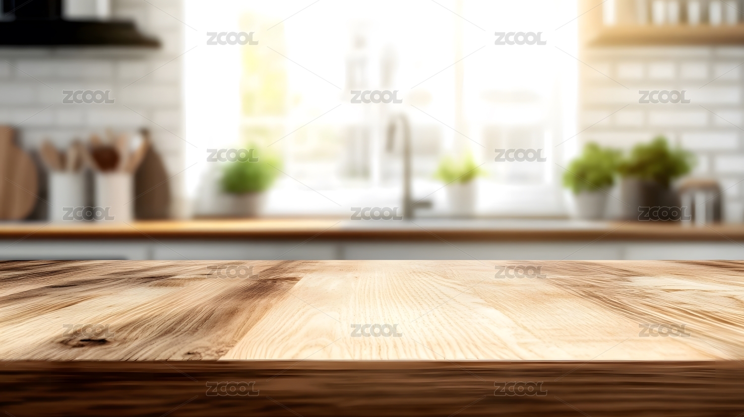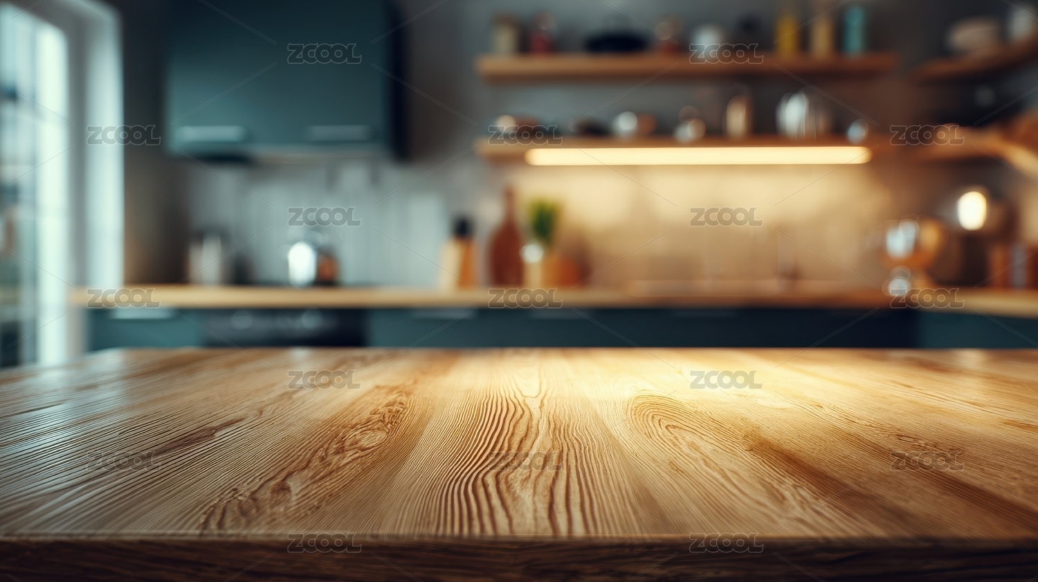 厨房,木桌,吊灯,窗户,架子,餐具,杯子,盘子,水壶,刀具