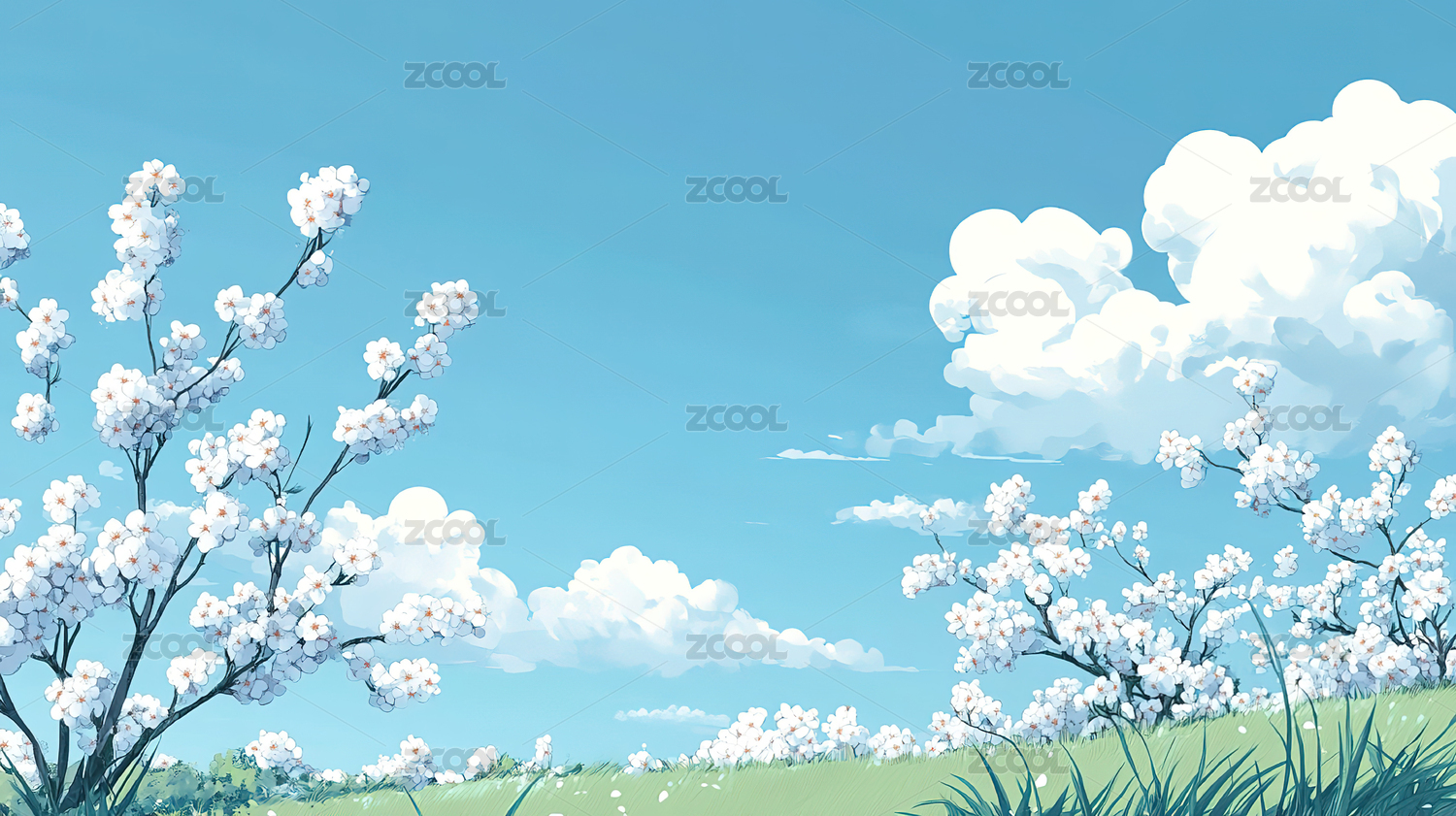 蓝天白云草地绿色大树插画风景壁纸