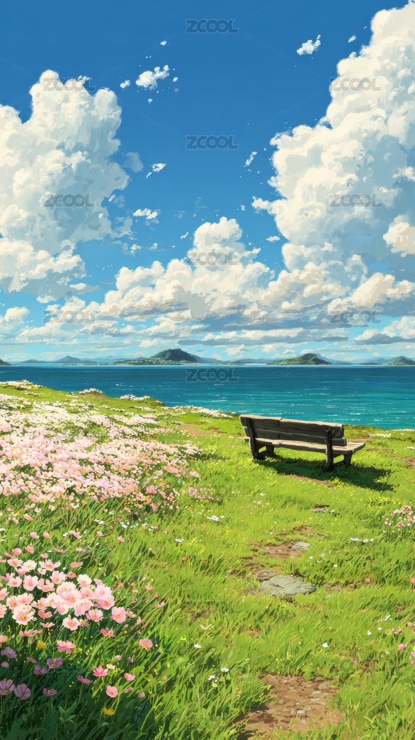 春天鲜花草地蓝天白云田园风光清新卡通背景