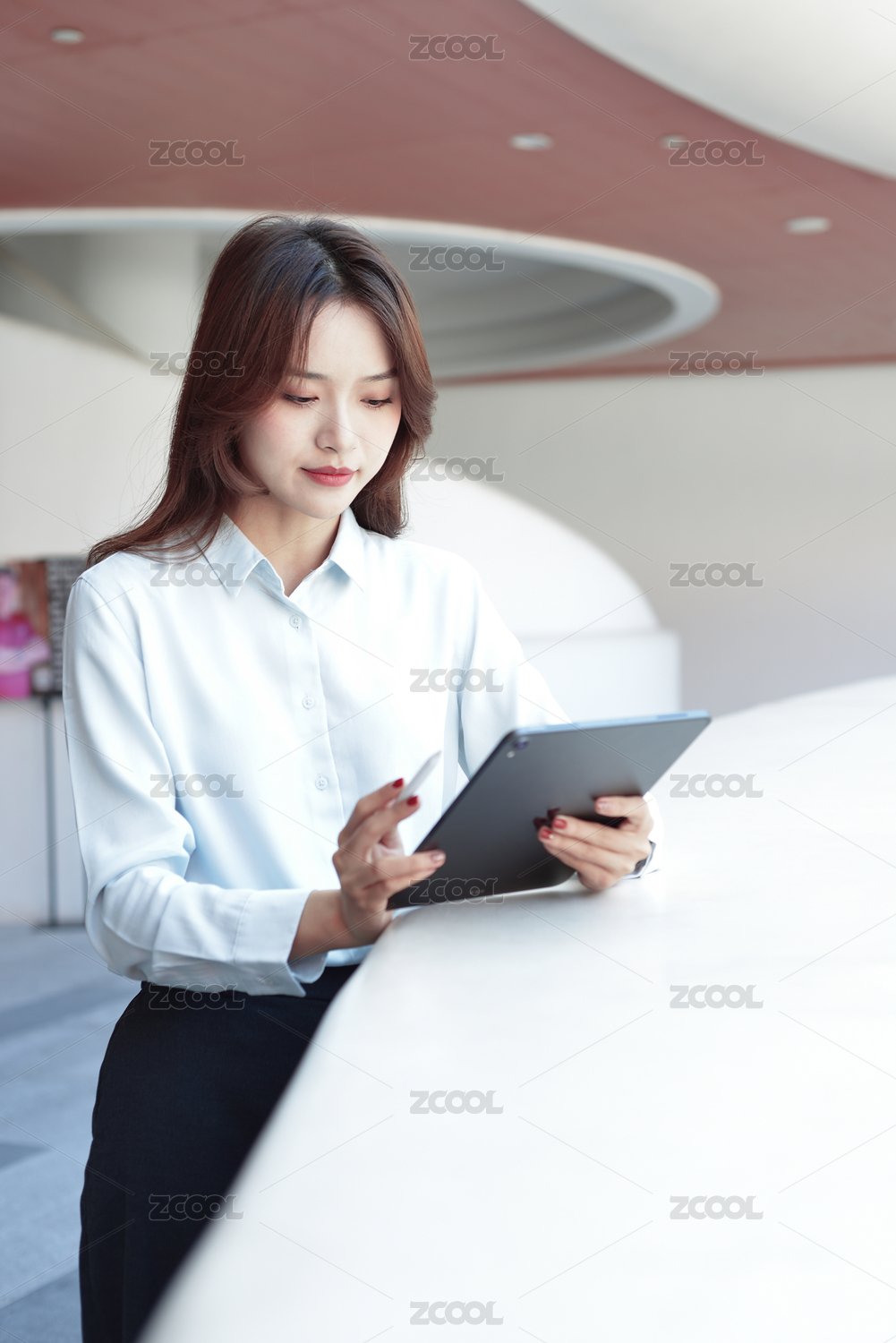 一个亚裔年轻女白领抱着平板电脑站立在办公区