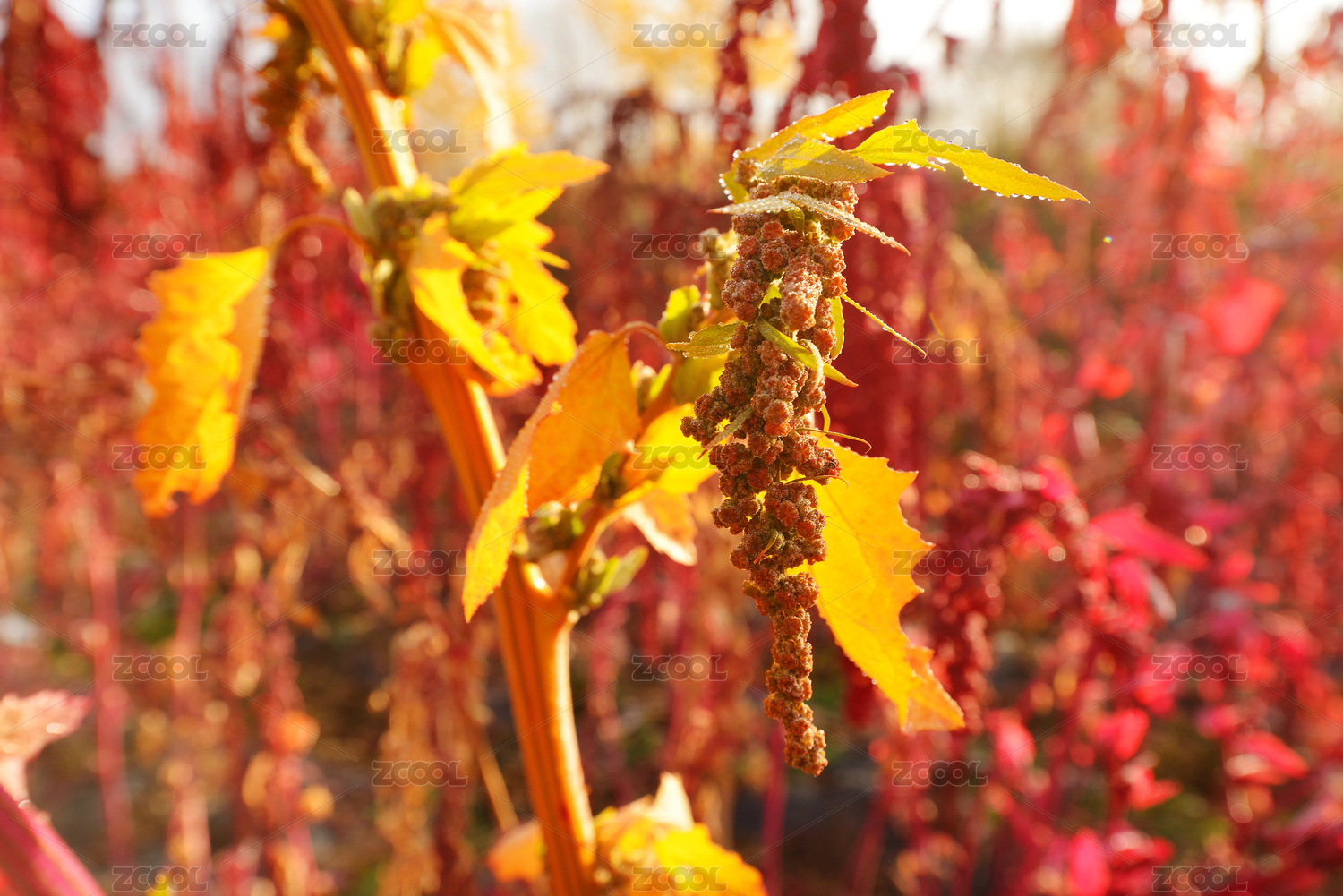 秋天农田里带着晨露在阳光照耀下的红色藜麦叶特写