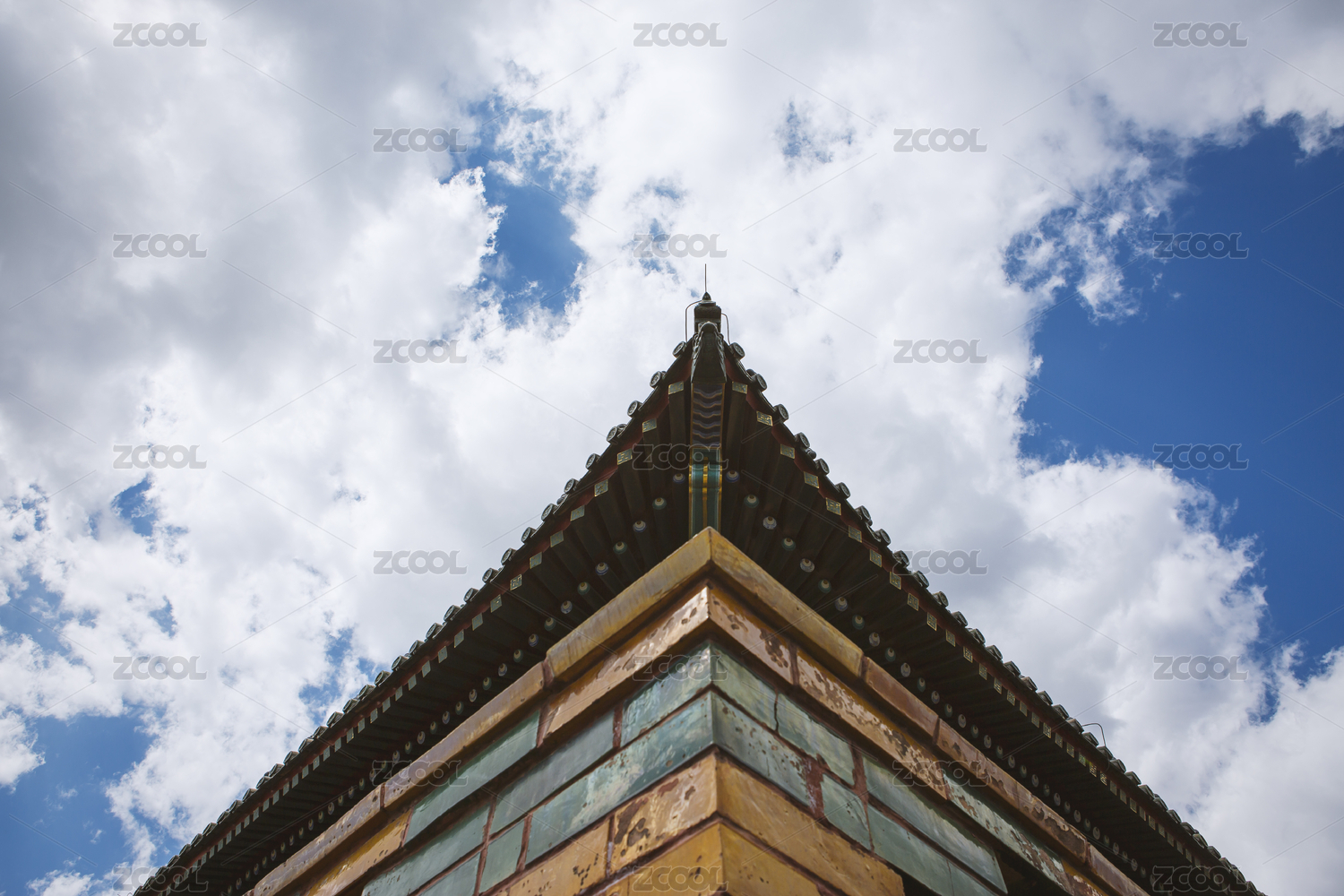 中国古寺庙建筑屋角飞檐琉璃瓦特写