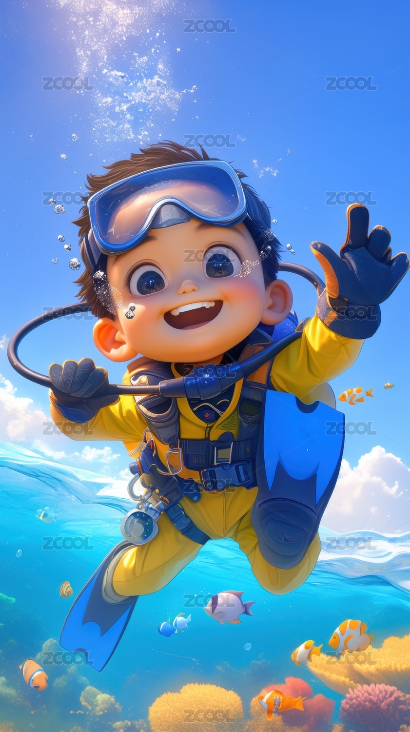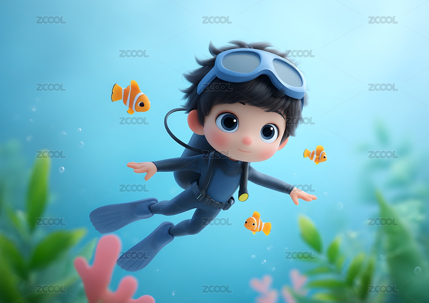 游泳馆头露出水面的小男孩3D立体卡通插画