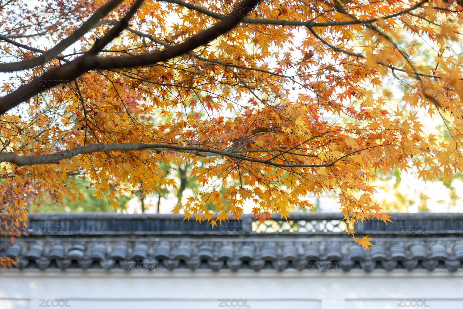 秋天金黄的树叶和徽派建筑