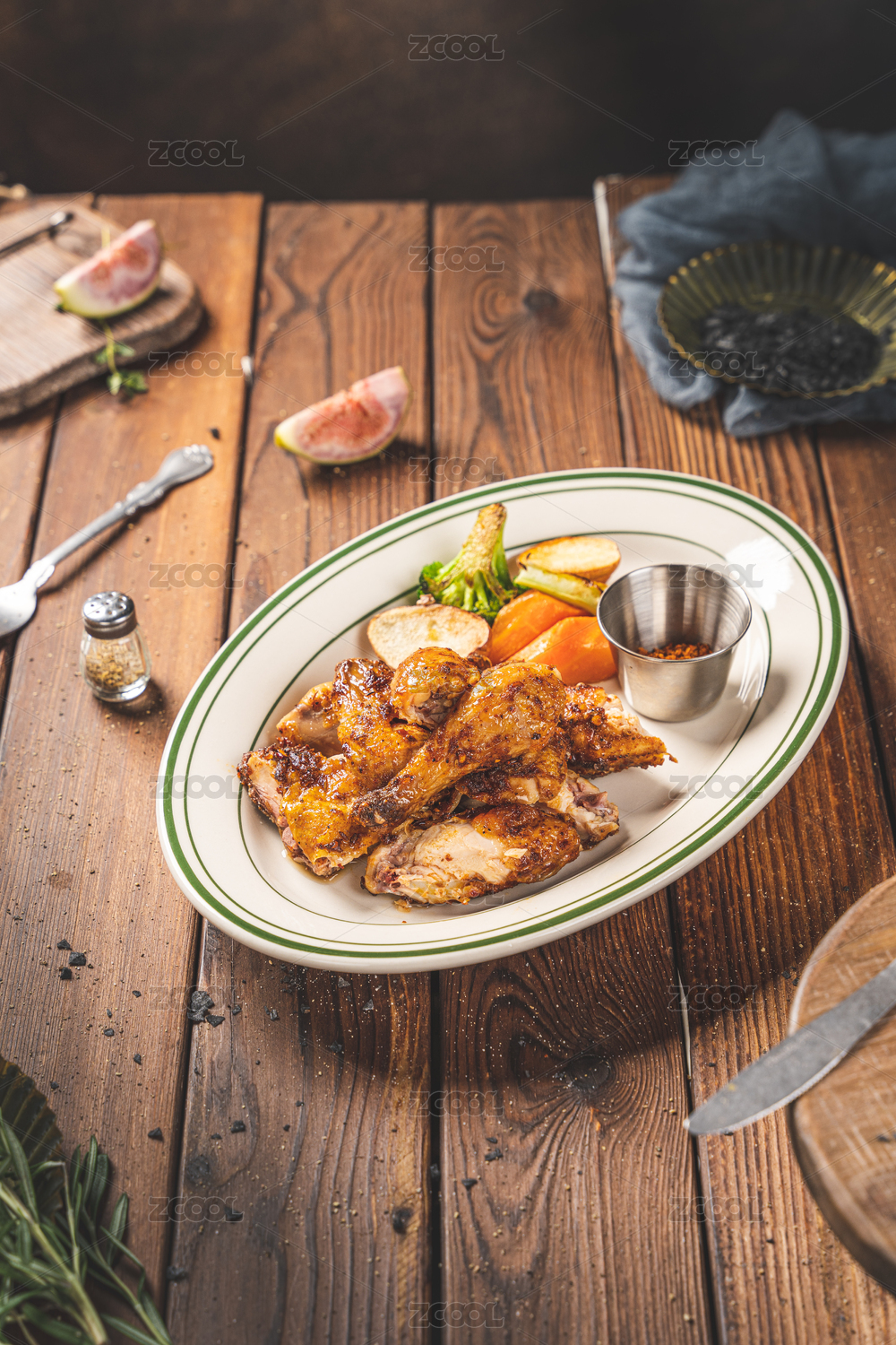 棕色木纹桌上有一份烤羊法排