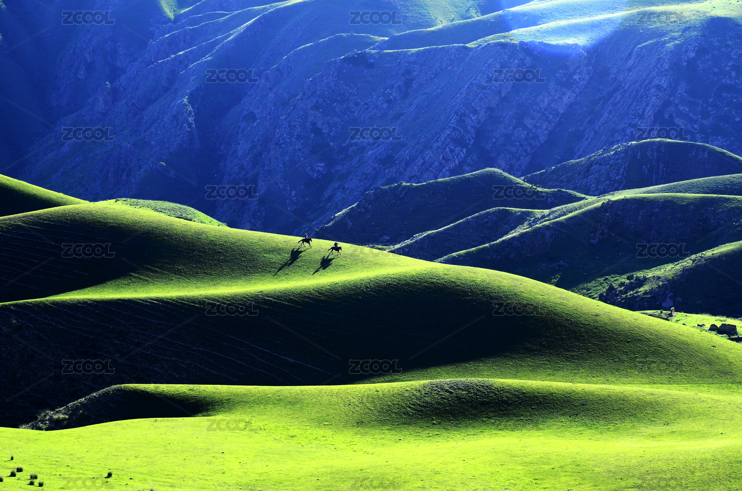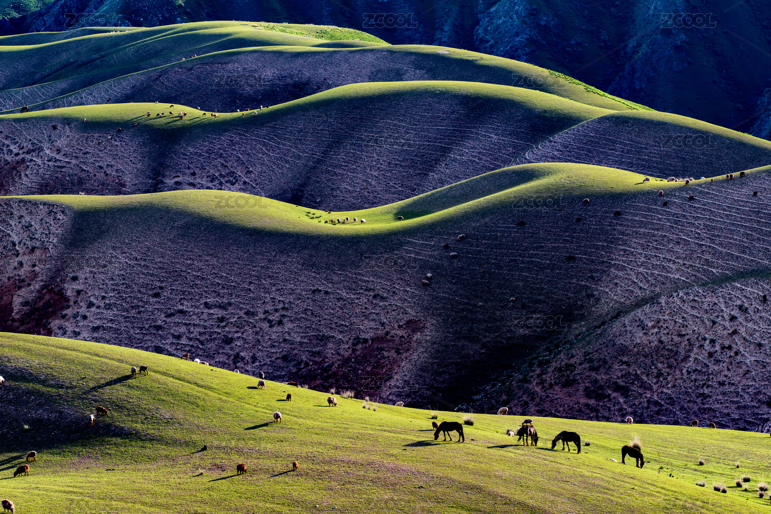 中国新疆起伏绿色草原放牧