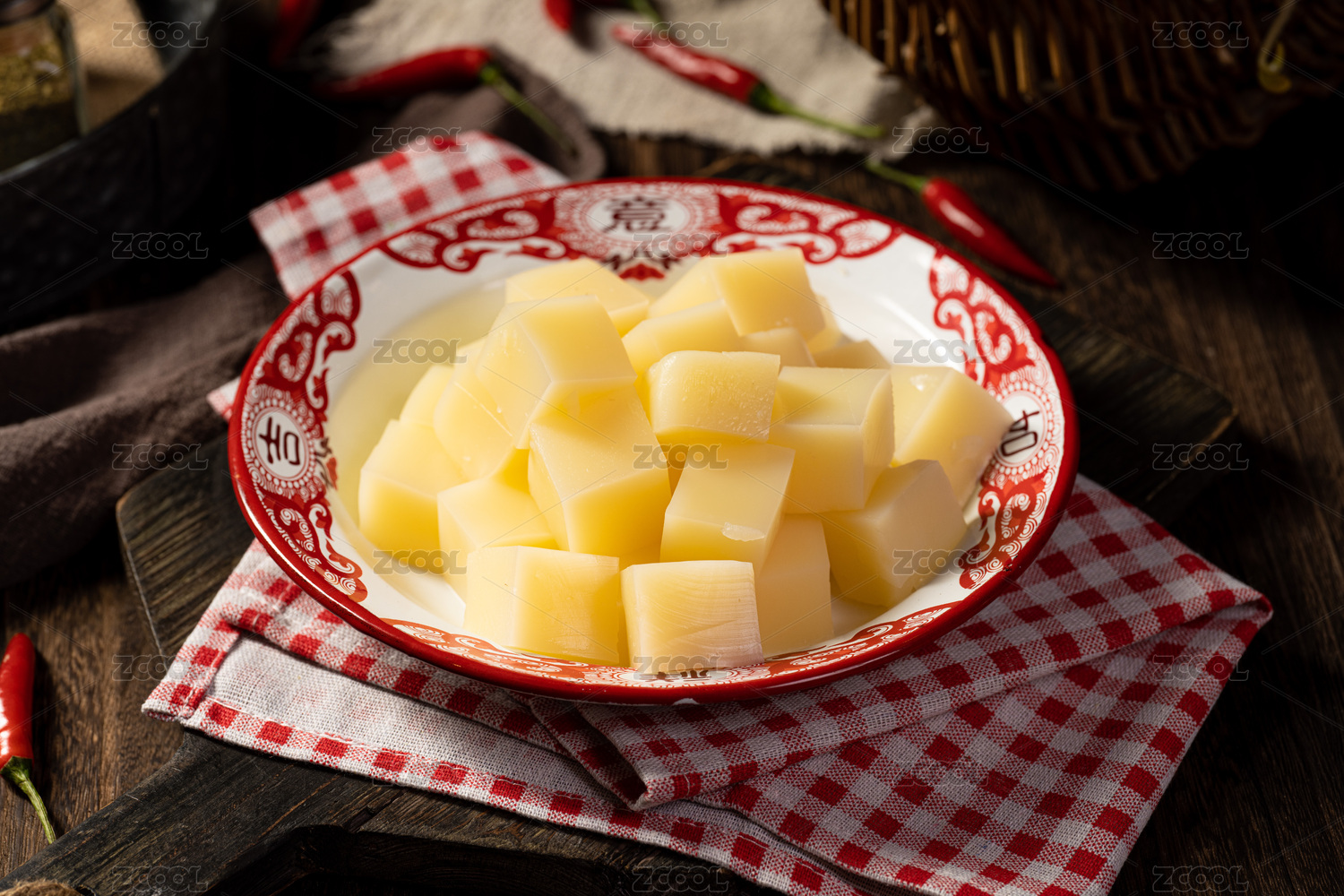 木桌上的白盘里的重庆火锅菜品生切南瓜块