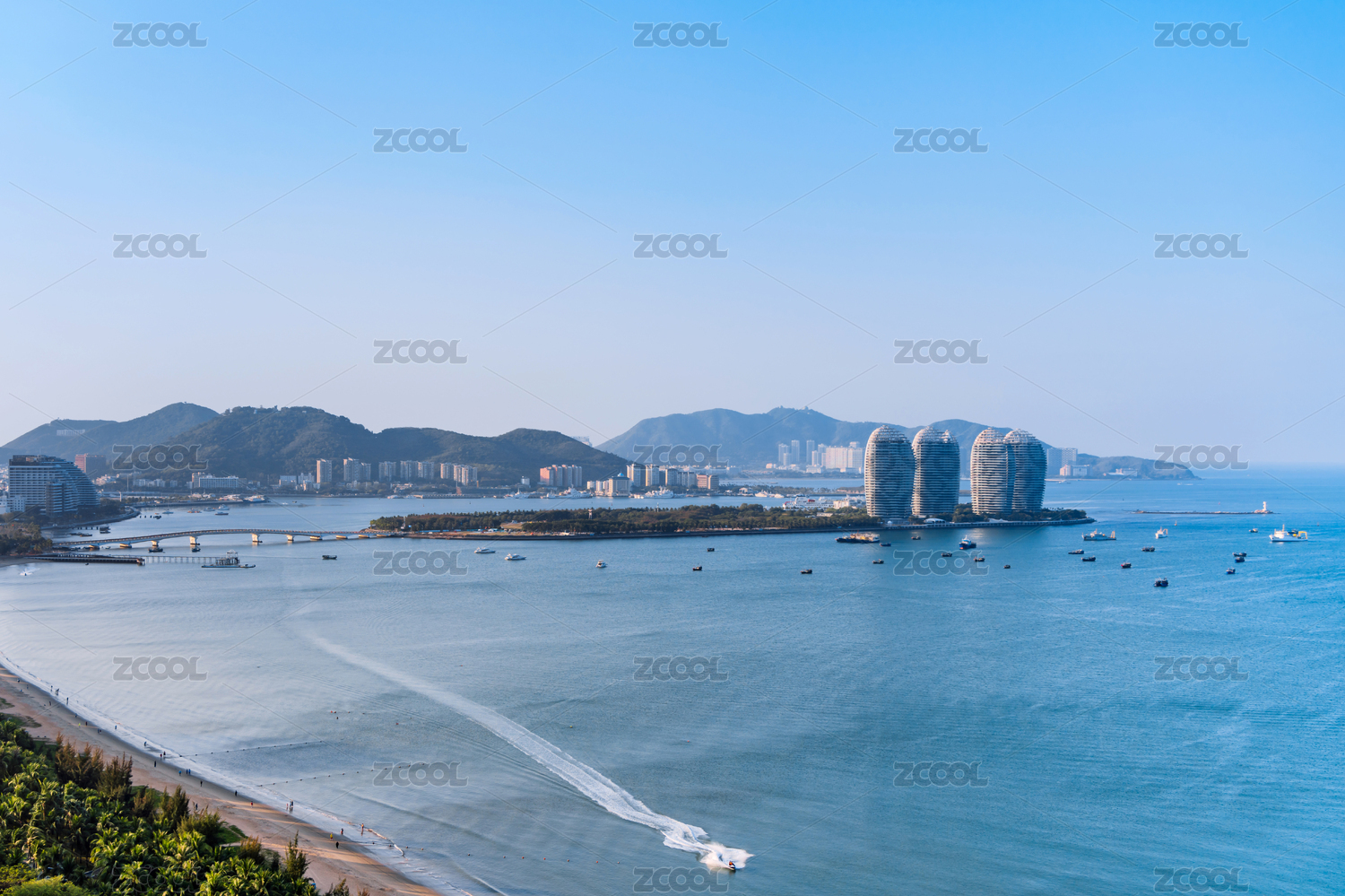 中国海南三亚凤凰岛三亚湾海岸线高视角风光
