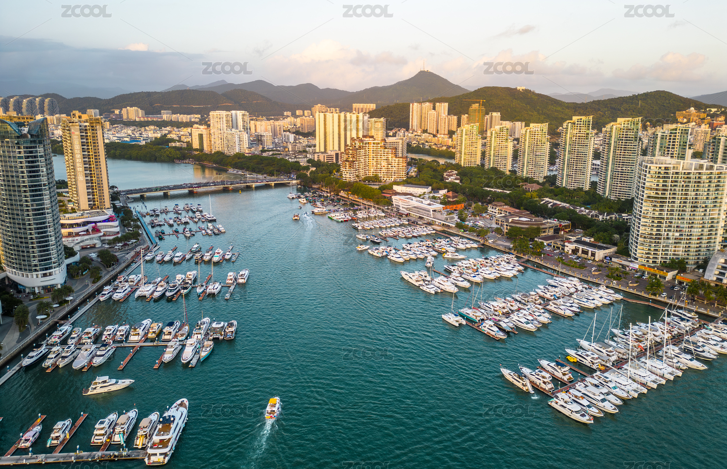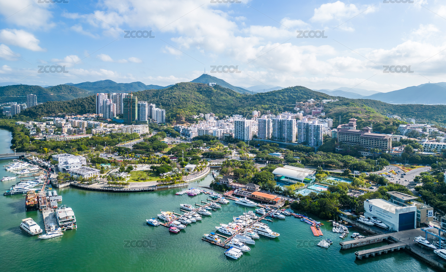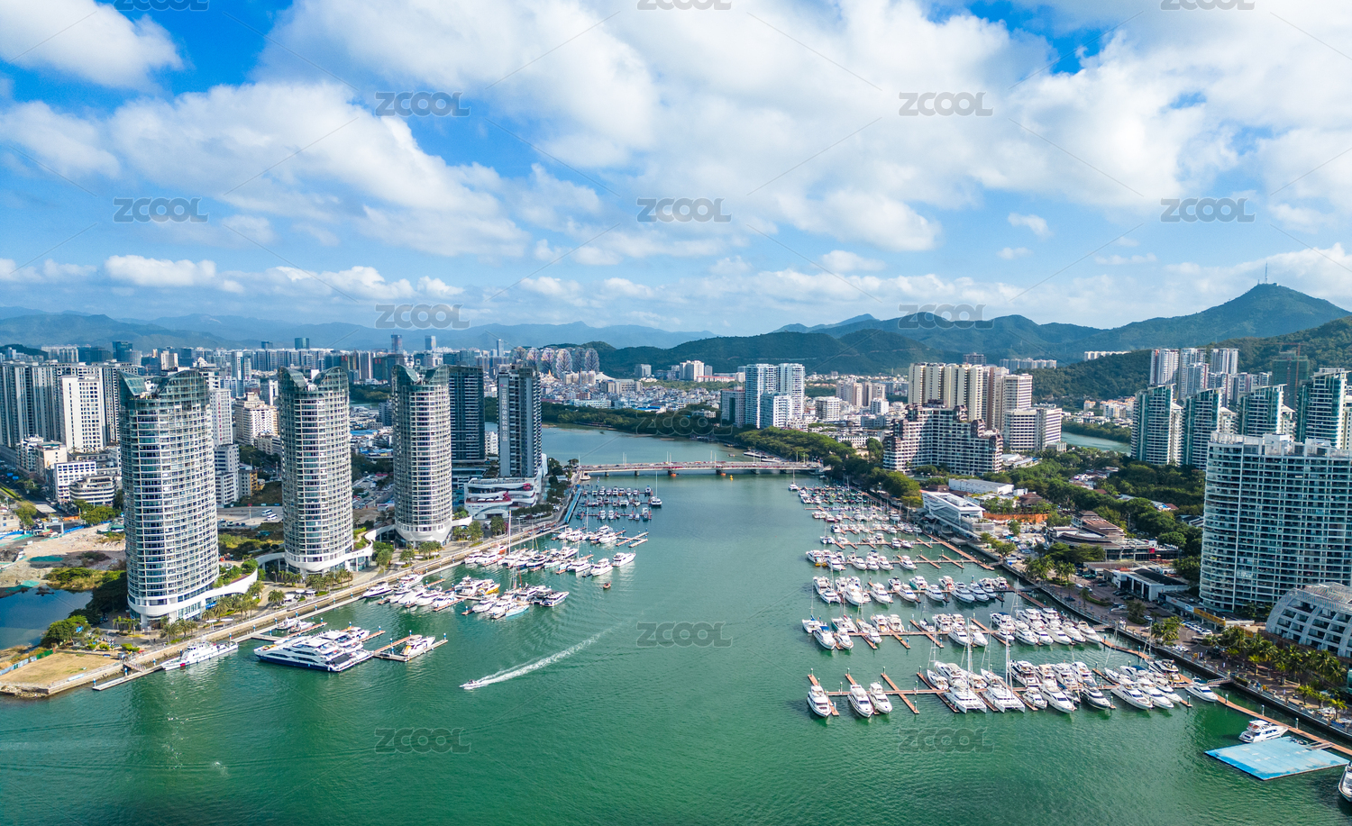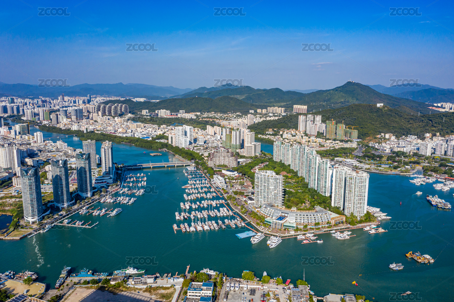 航拍海南三亚鸿洲国际游艇码头两河三岸景观