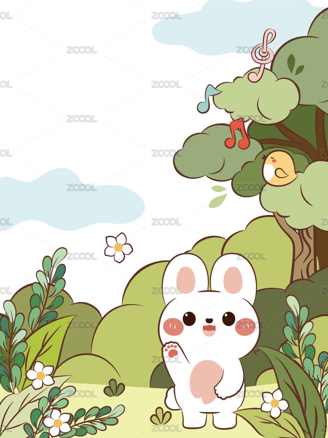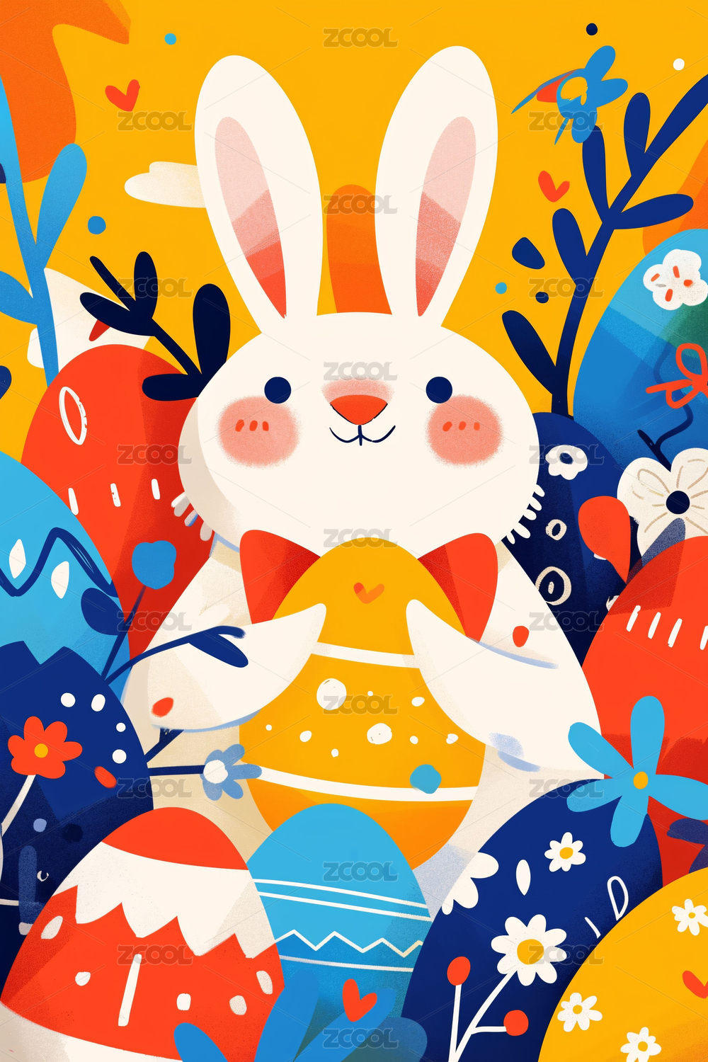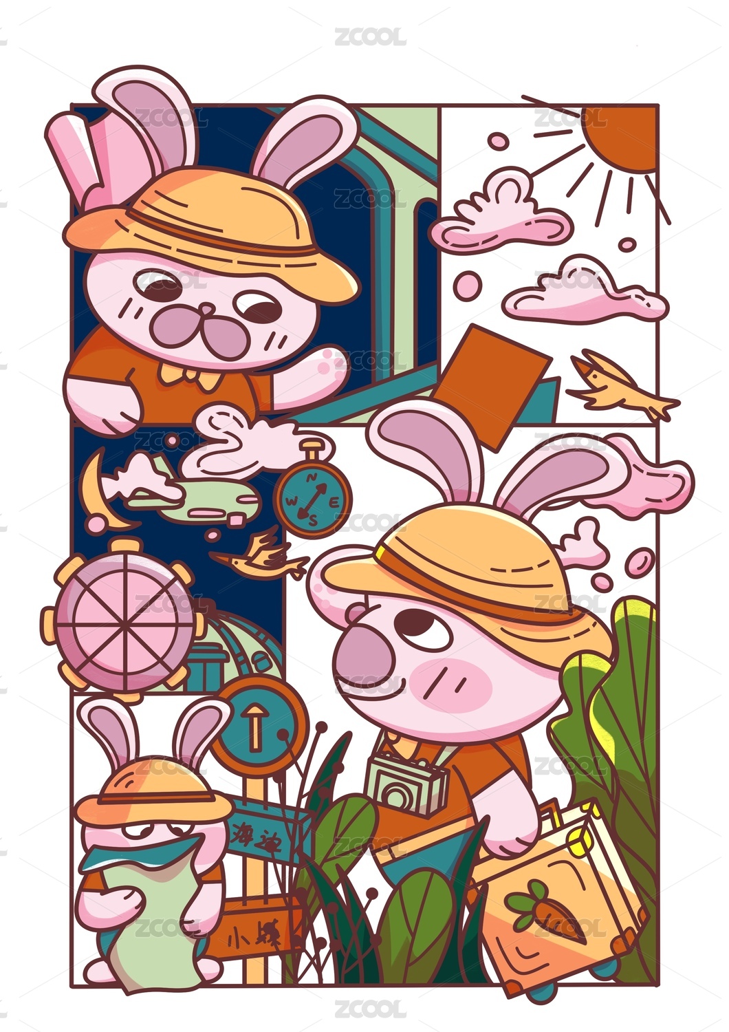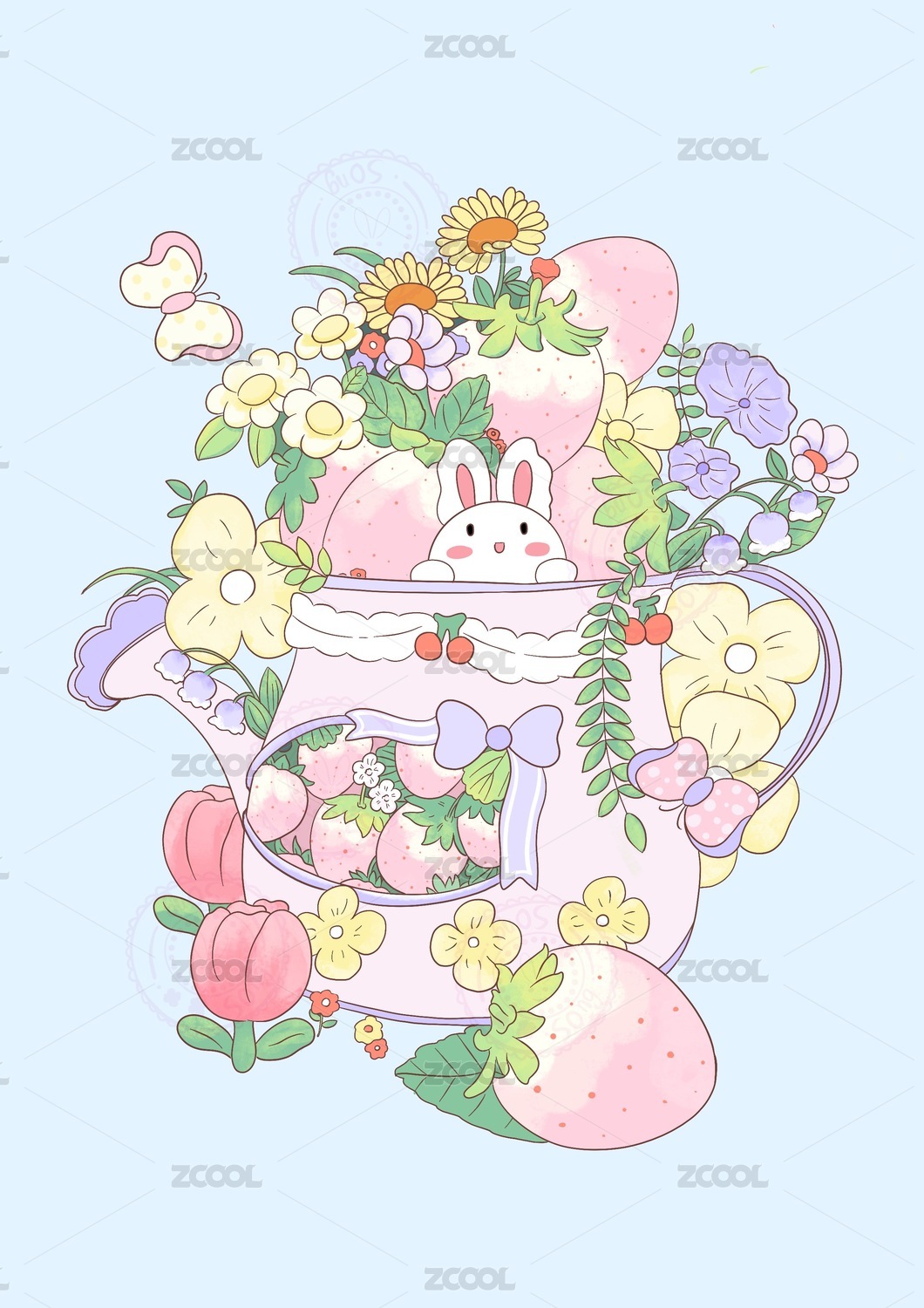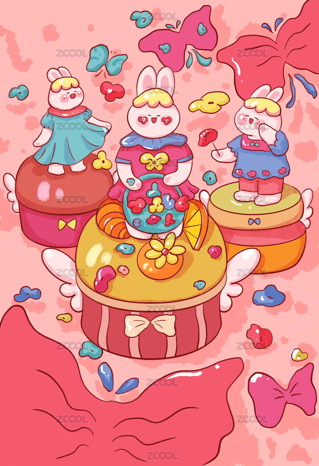 糖果色卡通兔子甜品蛋糕场景插画海报