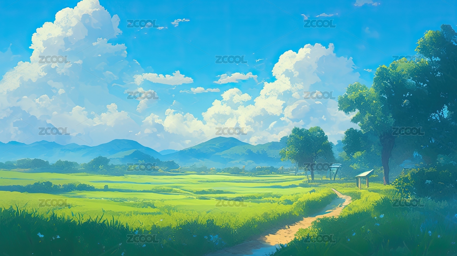夏天户外旅行山峰房屋乡村风景蓝天白云插画