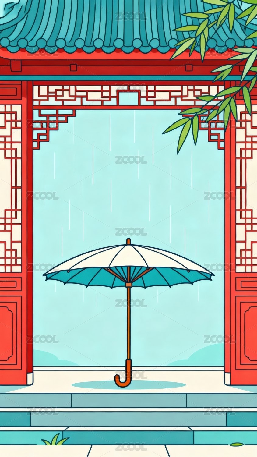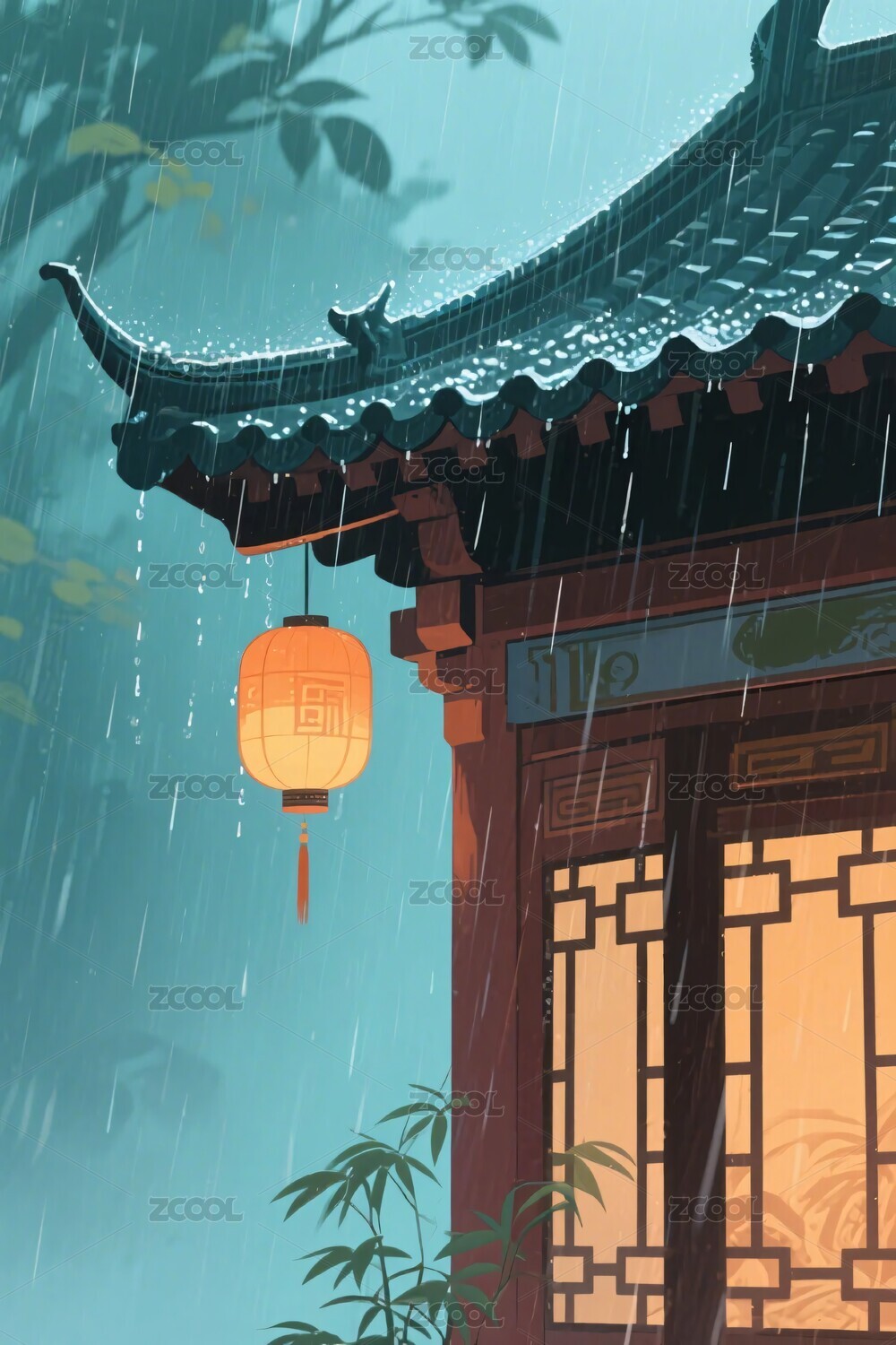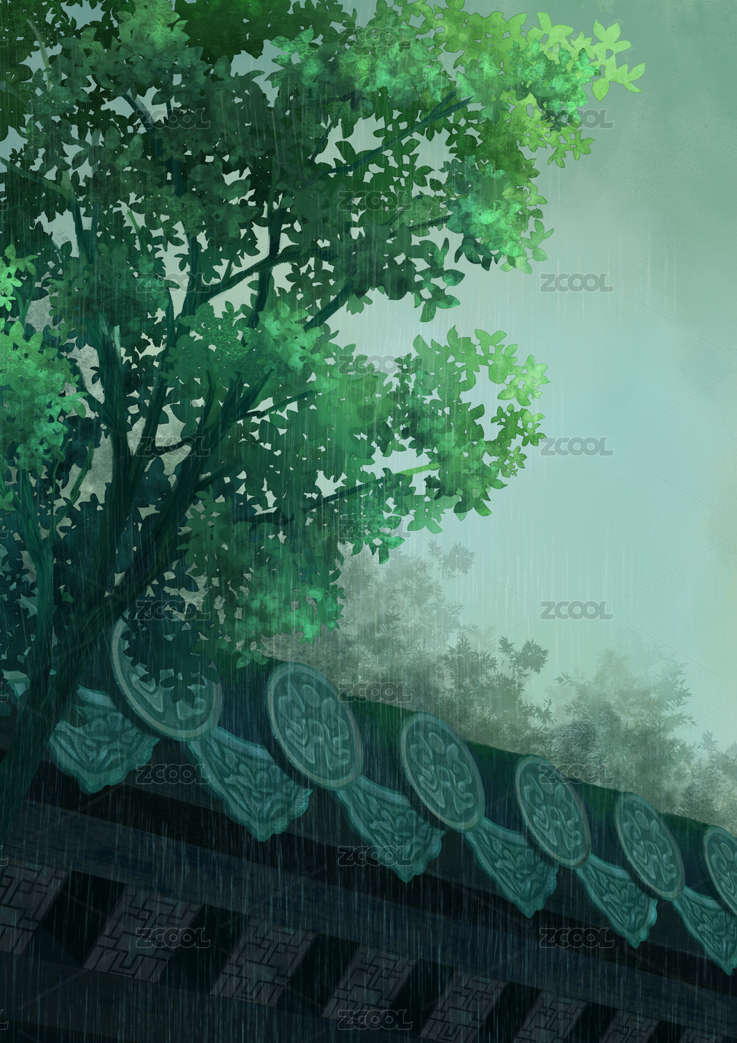雨中屋檐朦胧植物风景古风中式复古中景树