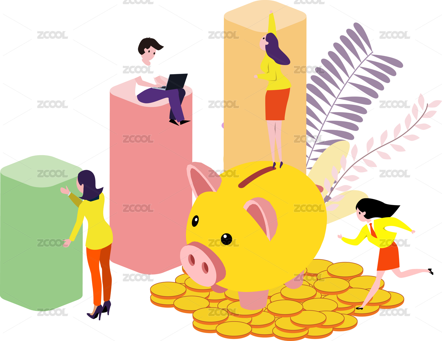 金融理财概念商务插画,职员在储蓄罐钱堆砌金币