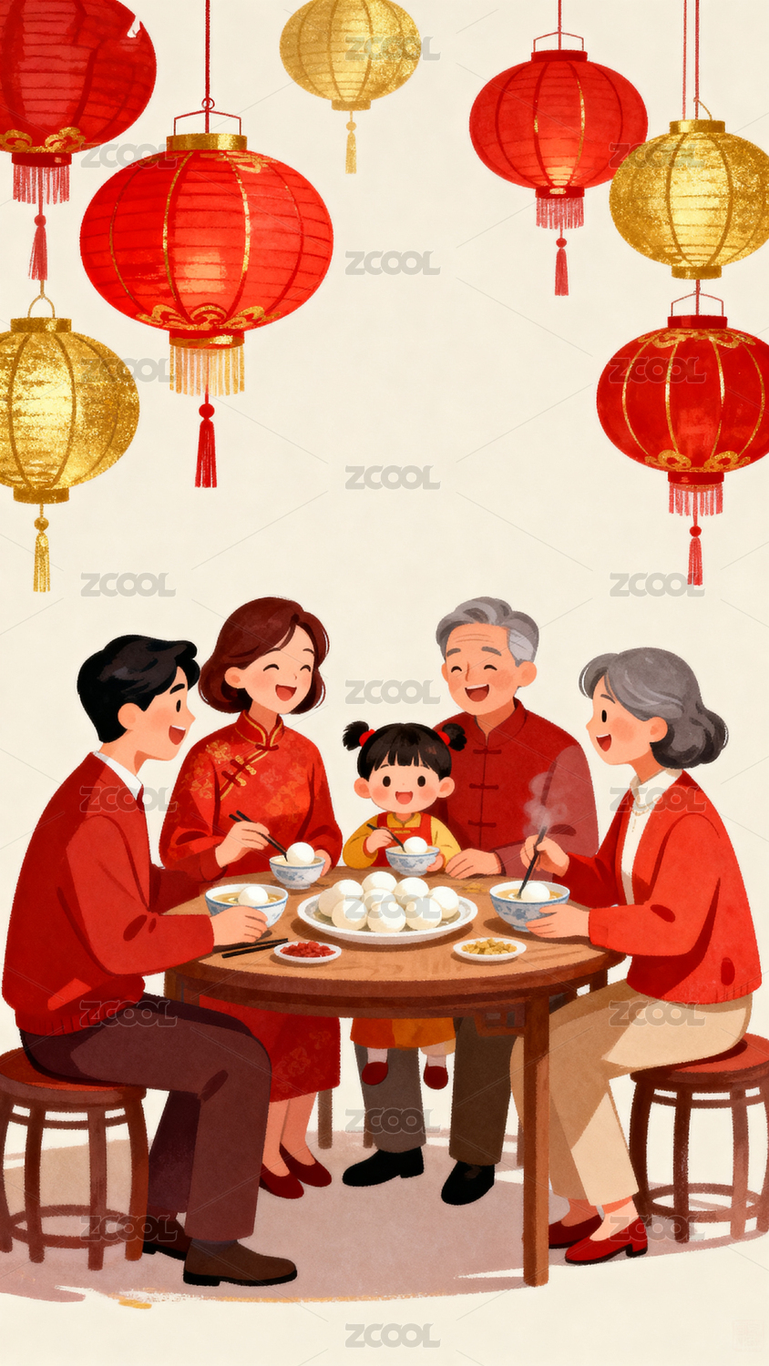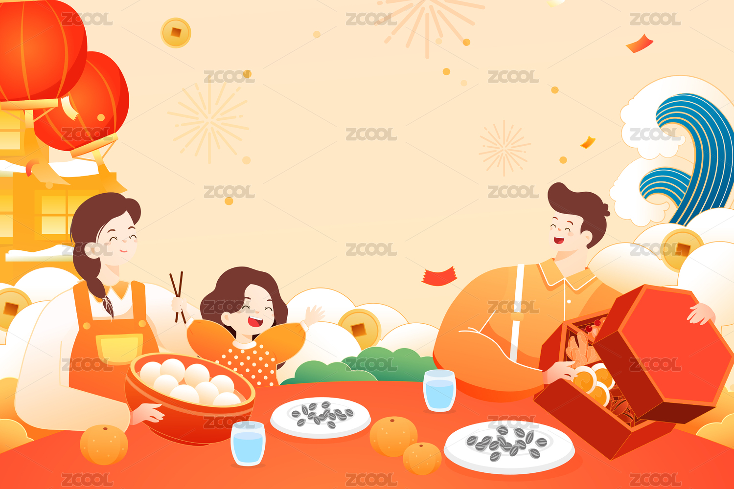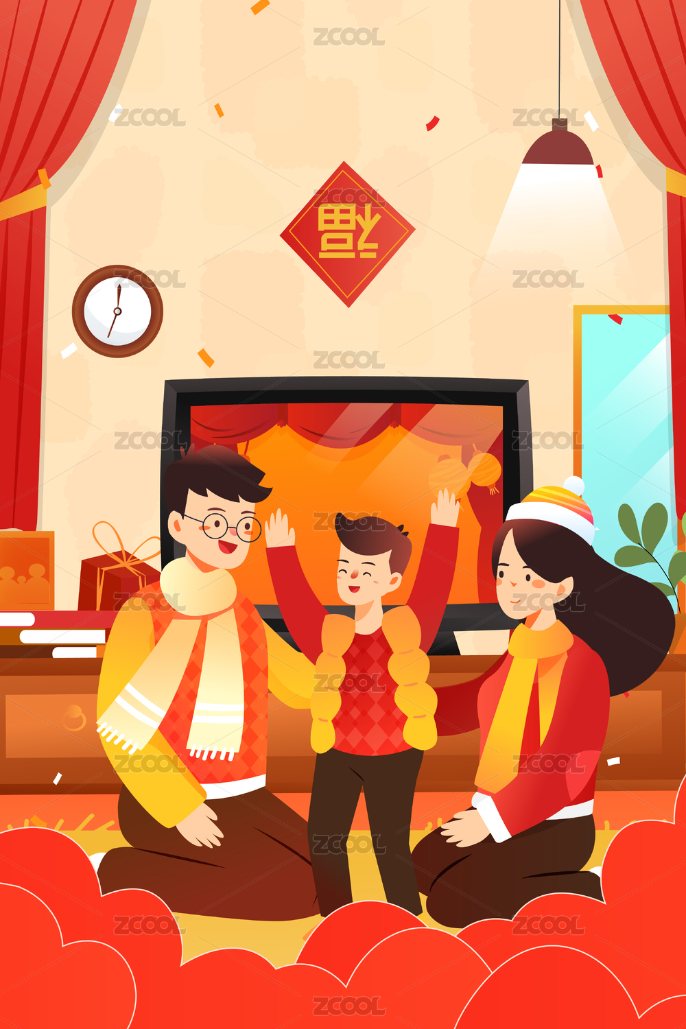 卡通2020新年春节看春晚合家欢中国风背景矢量插画