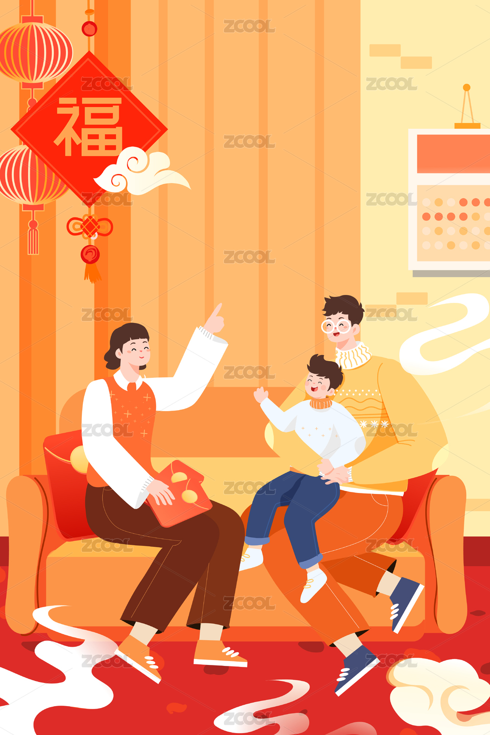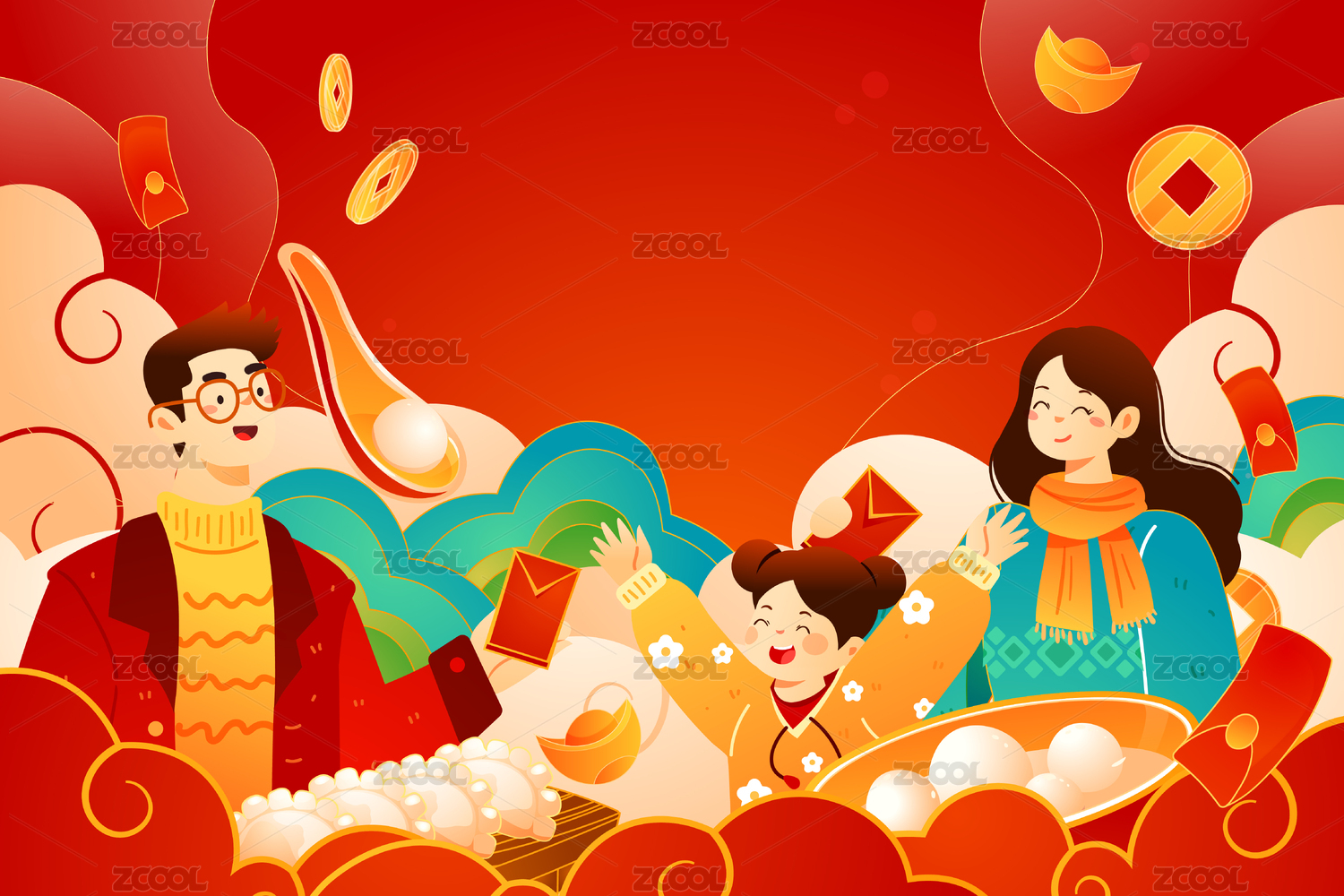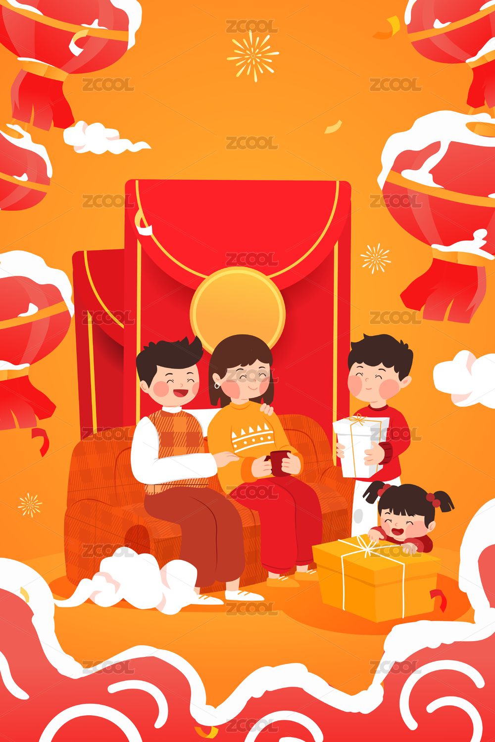 矢量,卡通,渐变,扁平,插画,插图,节日,礼物,红包,家人